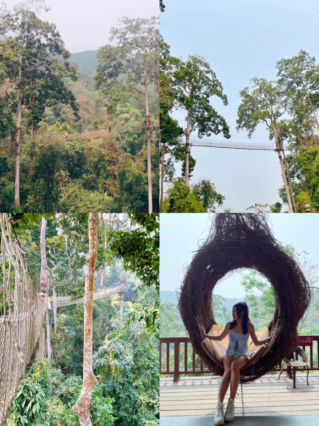 ▪️ 望天树[地点]体验高空树冠走廊,全程500米,还是很有趣的!走树冠走廊时,还有帮拍照(20元/张)和航拍(80元),✈️航拍还是很值的,拍得很👍(我们是报了当地一日团去的,260元/人,因为询了一下价格,一日团比划算,包车要700+元➕🎫望天树套票198元/人)