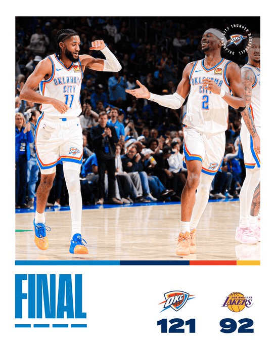 虎扑11月13日讯今天NBA常规赛雷霆主场对阵湖人的比赛已经结束。全场战罢,雷霆以121-92战胜湖人。