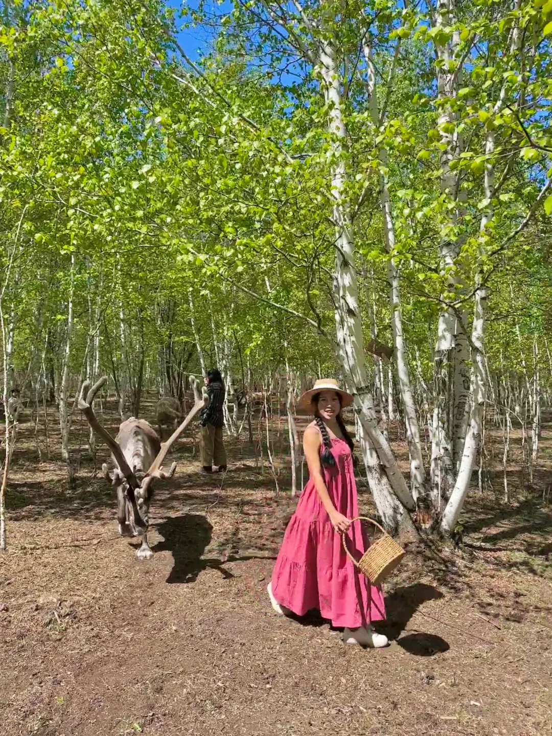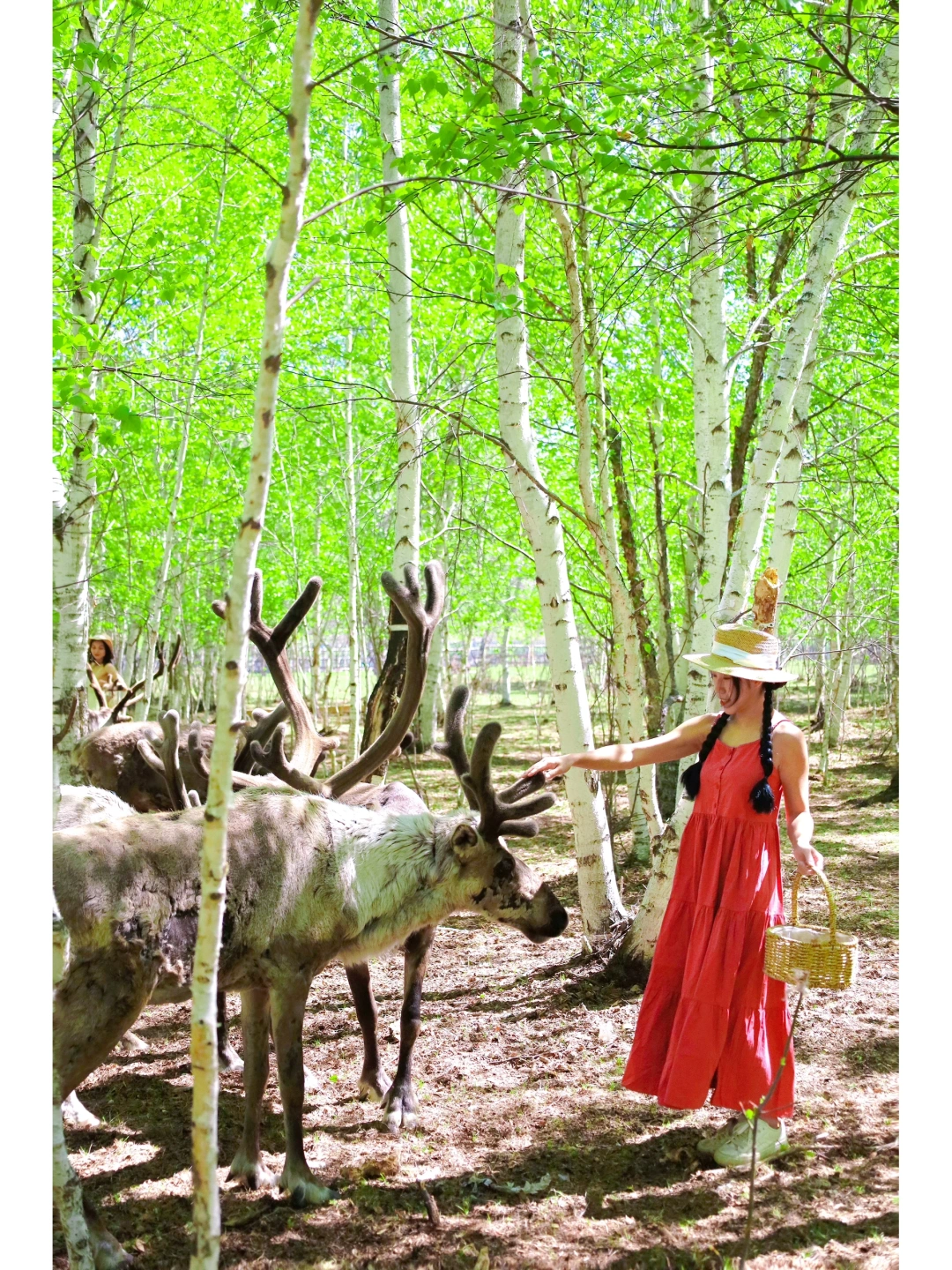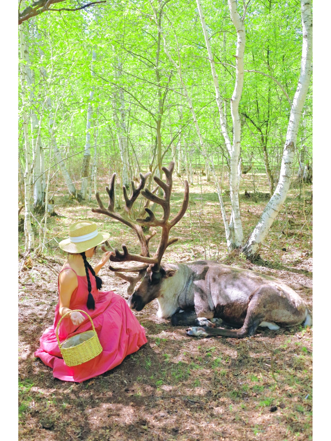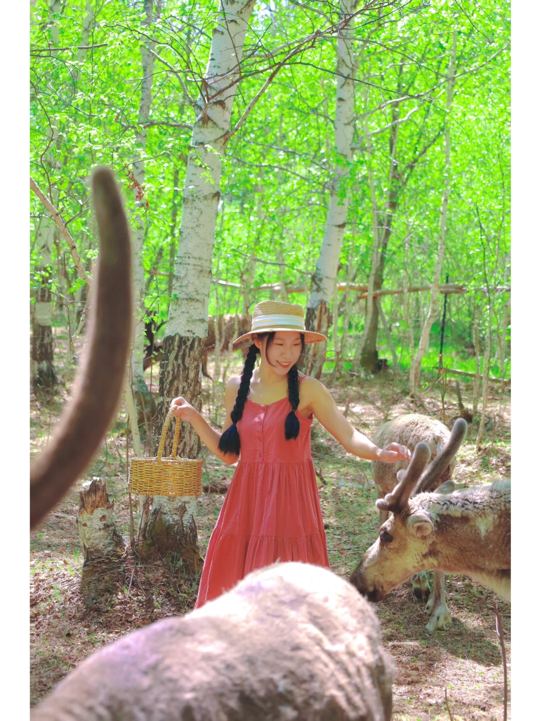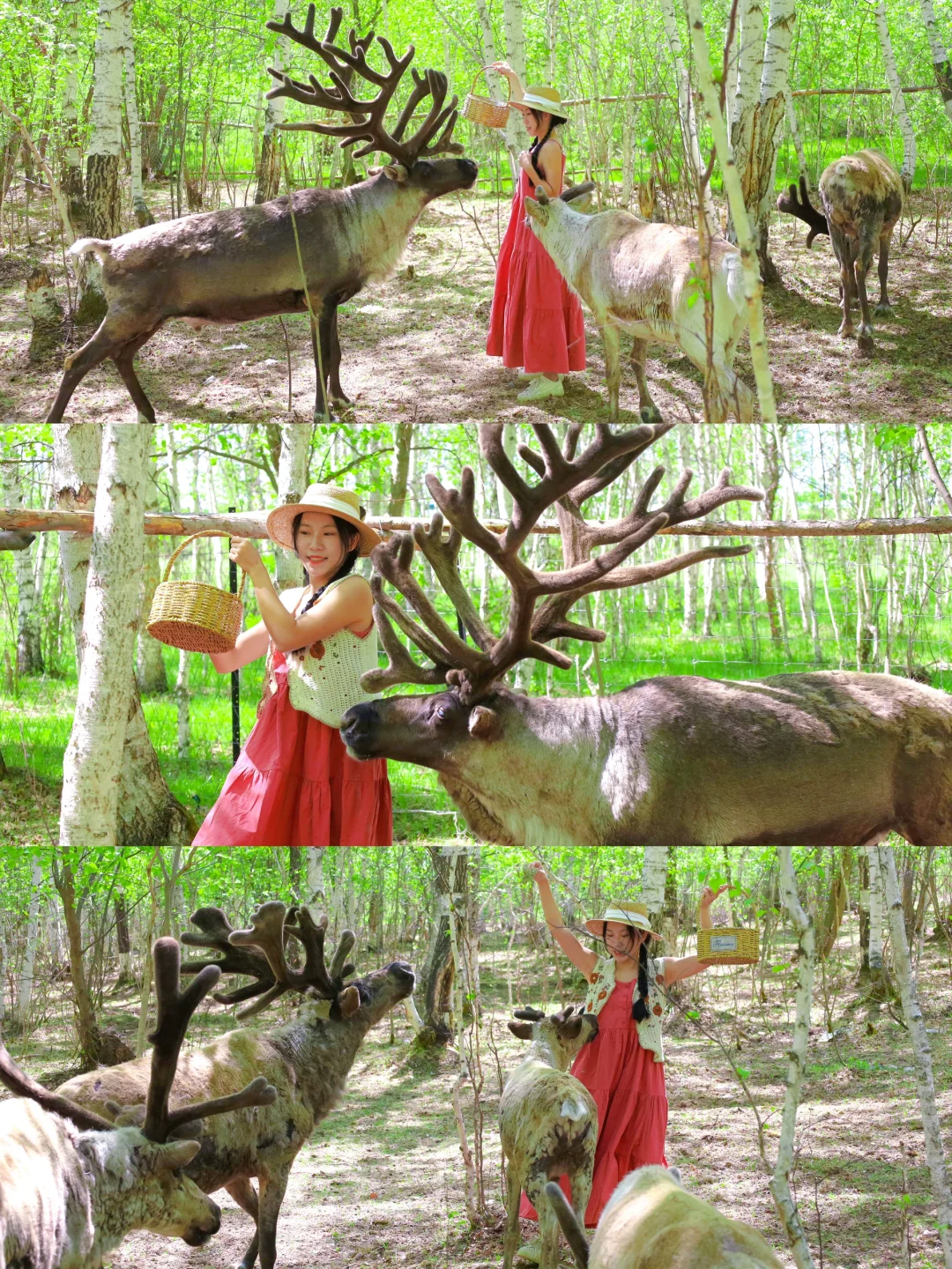 一开始我是很害怕的,毕竟驯鹿比我人还大只,它们看着我拿着一篮苔藓,都向着我冲过来,全程尖叫,表情失控,朋友帮我拍的照片几乎都是表情包😂