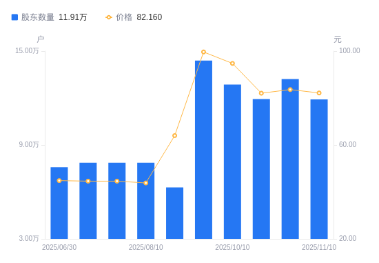 近一年(2024年12月31日至2025年11月10日),长川科技A股股东户数从8.3万户,增加至11.91万户,增幅43.50%,区间股价上涨75.33%。