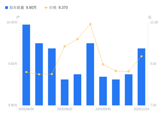 近一年(2024年11月29日至2025年11月10日),西安饮食A股股东户数从11.5万户,减低至9.9万户,降幅13.91%,区间股价下跌8.67%。