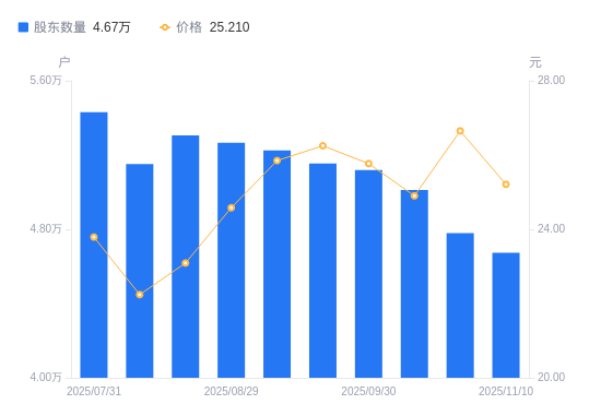 日期A股户数(户)流通A股户均持股数(股)户均持股市值(万元)2025-11-104673310674.6126.912025-10-314780110469.3227.902025-10-10501259983.9224.862025-09-30511949775.4425.192025-09-19515429709.4425.492025-09-10522449578.9724.762025-08-29526669502.2223.362025-08-20530629431.3021.782025-08-08515139714.9021.612025-07-31543139214.0721.92