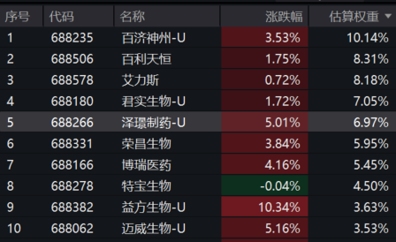 科创创新药ETF汇添富(589120)标的指数成分股多数上涨,益方生物(688382)上涨10.34%,泽璟制药、迈威生物涨超5%,博瑞医药涨超4%,百济神州、荣昌生物等涨超3%,百利天恒等涨幅居前。