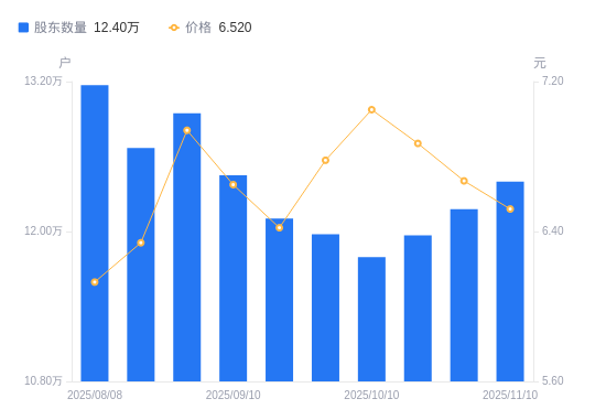 近一年(2024年11月20日至2025年11月10日),中色股份A股股东户数从11万户,增加至12.4万户,增幅12.74%,区间股价上涨28.25%。
