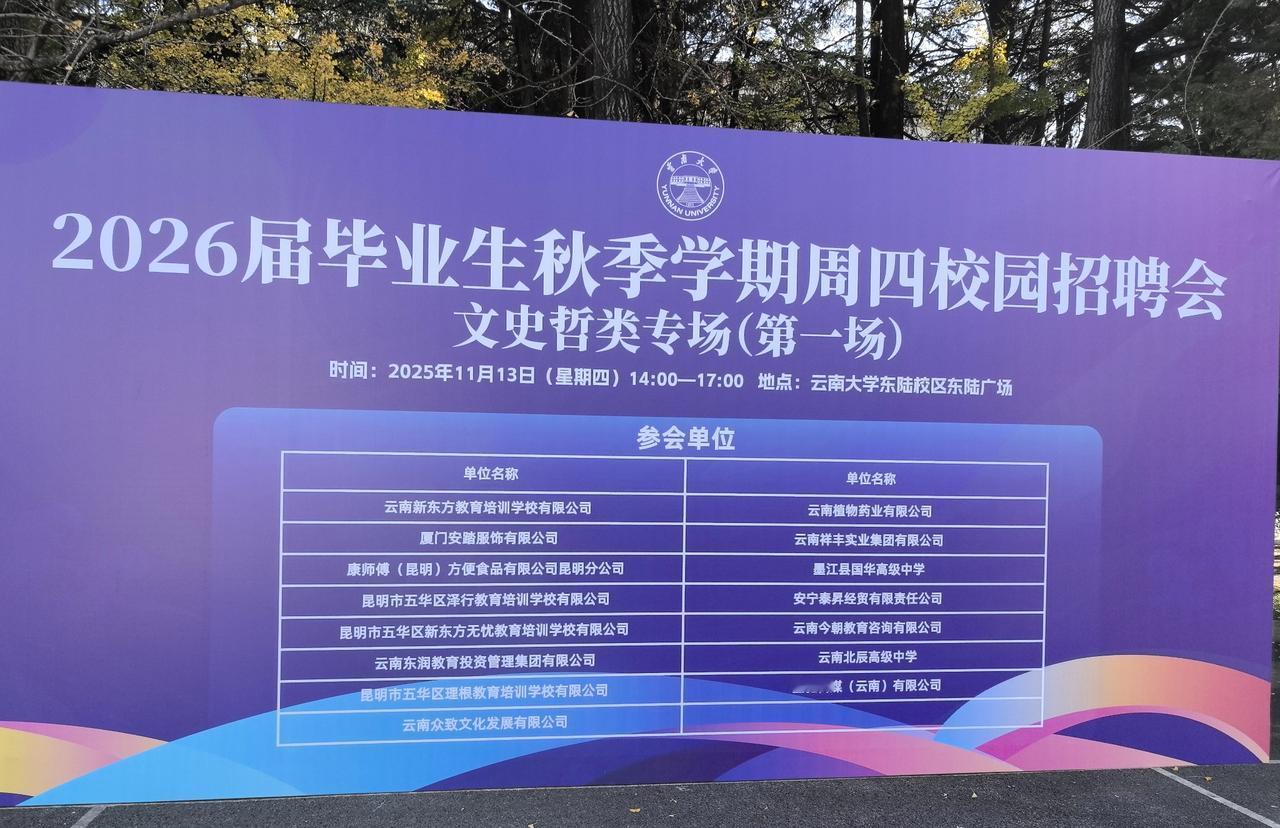 昆明,翠湖畔的云南大学,充满历史沧桑感,厚重、美丽。令人心生敬佩。 校园里碰巧看到一个秋季招聘会的牌子,参会单位数量质量感觉是不是小了一点啊…… 衷心祝愿莘莘学子们学有所成,学有所得。[笑][笑] 云南宝藏大学 云南大学美拍 云南大学花园 云南应届生求职