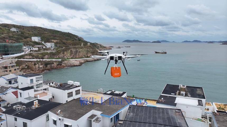 (图说:浙江舟山嵊泗县花鸟岛,仅用3分多钟,灯塔村村民就收到了淘宝闪购无人机送来的订单。)