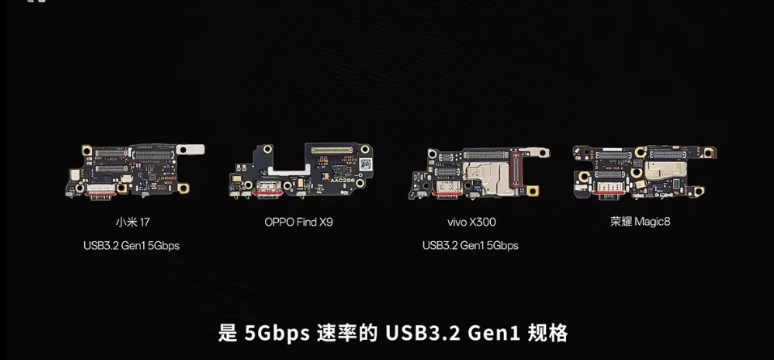 从微积分最新的旗舰标准版拆机横评来看,今年米OV的标准版旗舰都普及了超声波屏幕指纹,均采用了国内厂商汇顶的方案,不过不同的是,小米17、vivo X300和荣耀Magic8都采用了汇顶第二代超声波屏幕指纹,OPPO Find X9则是汇顶第一代超声波屏幕指纹,第二代超声波屏幕指纹的优势在于穿透性更强,不像第一代那样挑钢化膜。 另外,接口上,只有小米和vivo支持了5Gbps速率的USB 3.2Gen1,OPPO和荣耀则还是480Mbps的USB2.0,经常用使用有线数据传输或插U盘使用的小伙伴在购机时需注意一下。