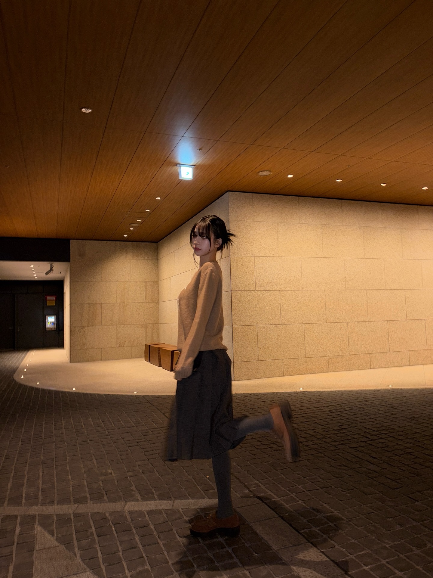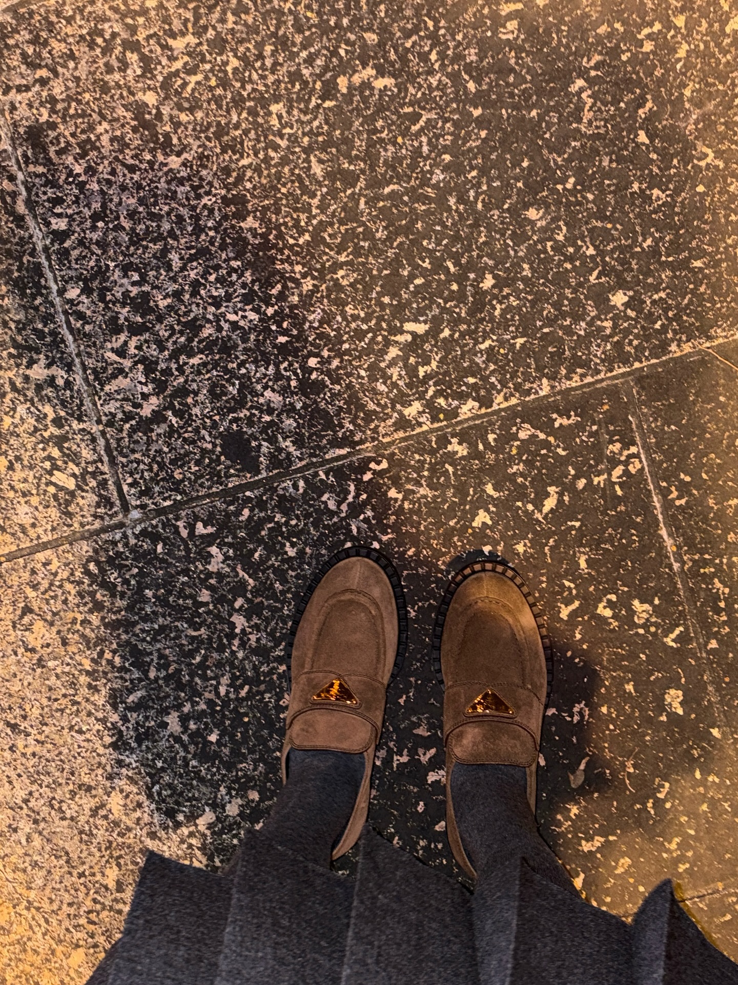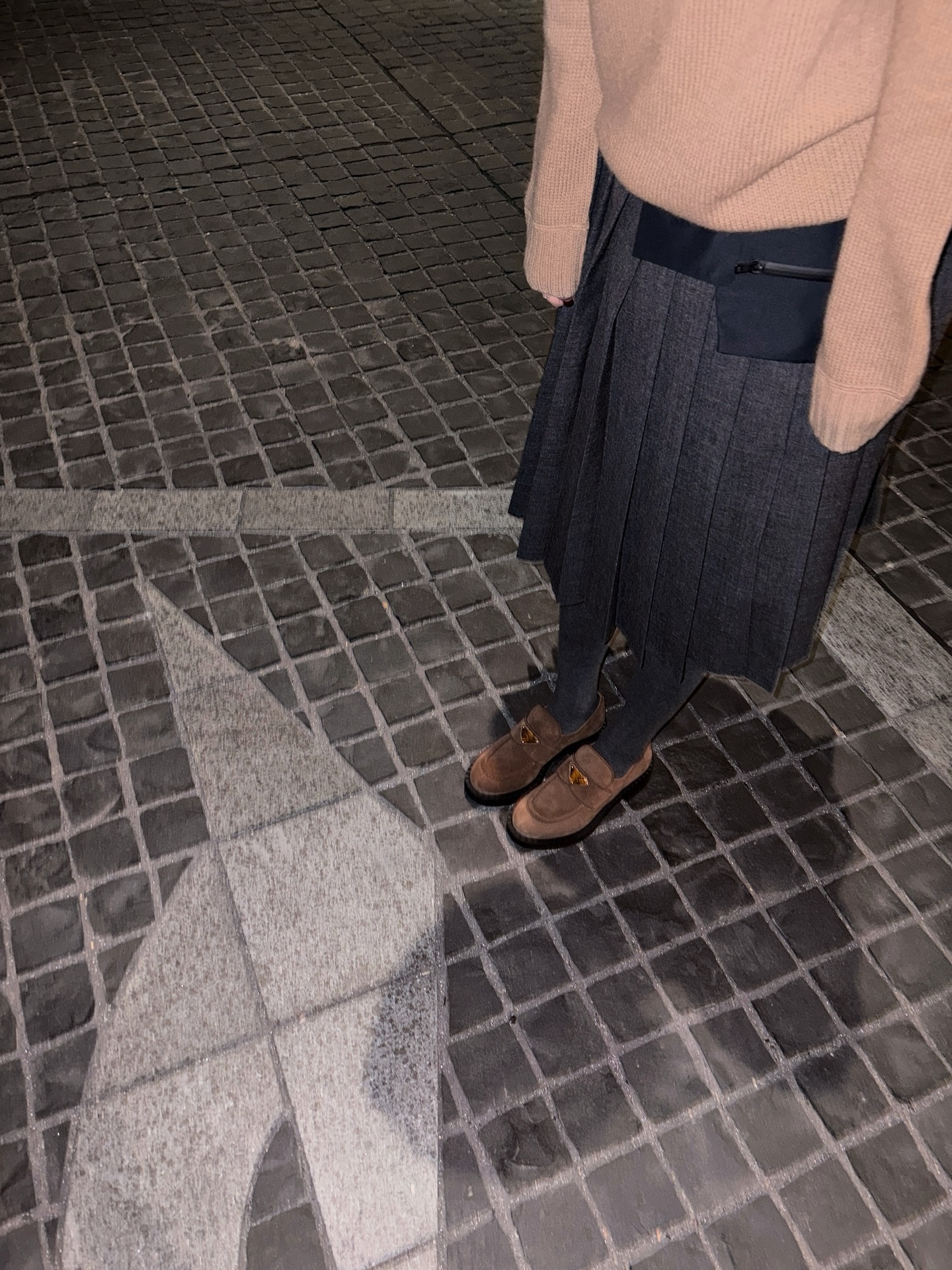 Karina x Prada 品牌代言人一组新推广,棕色针织毛衣搭配黑色半身裙,惹人注目Chocolate 绒面皮革乐福鞋,秋日感氛围十足🤎