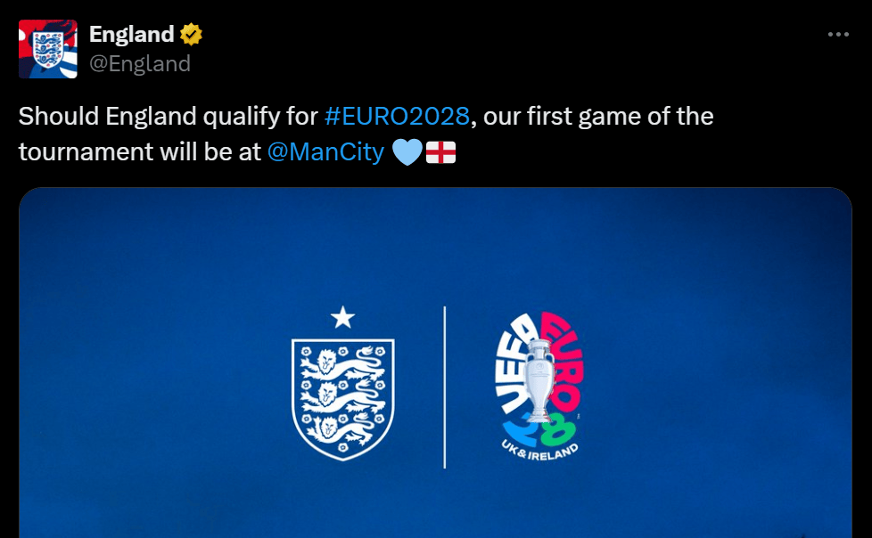 英格兰国家队随后发帖称,如果英格兰晋级2028欧洲杯,他们在该届赛事的首场比赛将在曼城主场伊蒂哈德举行。