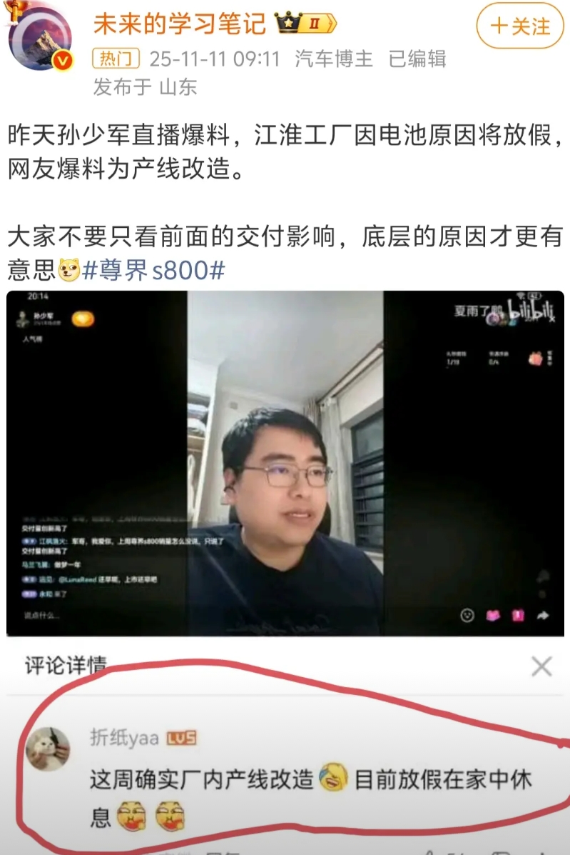 余承东压力山大啊,一边是尊界不断增长的订单速度,一边是江淮尊界产线的停产改造,供需平衡的难度又加码了。 博主孙少军在直播间爆料说,尊界因为电池供应不上,当前正在放假进行产线改造升级。评论区里有尊界超级工厂的员工也证实,这周厂里确实正在进行产线改造,他目前正放假在家里休息。 一边是用户纷纷在线催交付的压力,一边是产线升级按下的暂停键,这供需的“跷跷板”确实不好平衡啊!不过,磨刀不误砍柴工,产线改造都是为了后续提升产能,毕竟当前尊界S800的月产能只有约4500台,远低于累计1.5万+的订单量。 希望改造完能更快把车交到用户手里吧,不要欠车过年了。