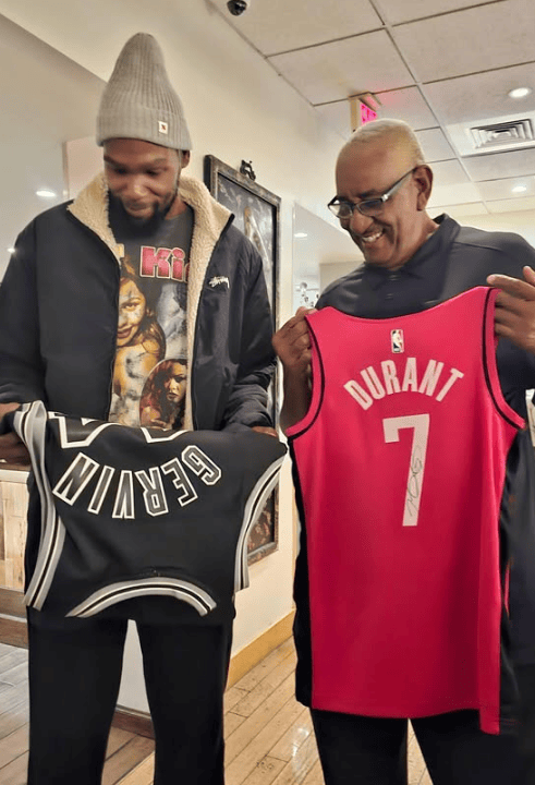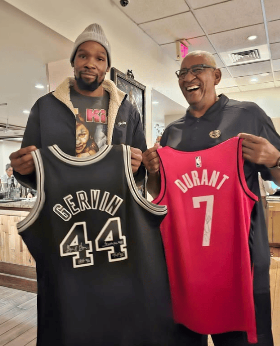 杜兰特此行是来为格文的新书进行宣传,两人也交换了签名球衣。