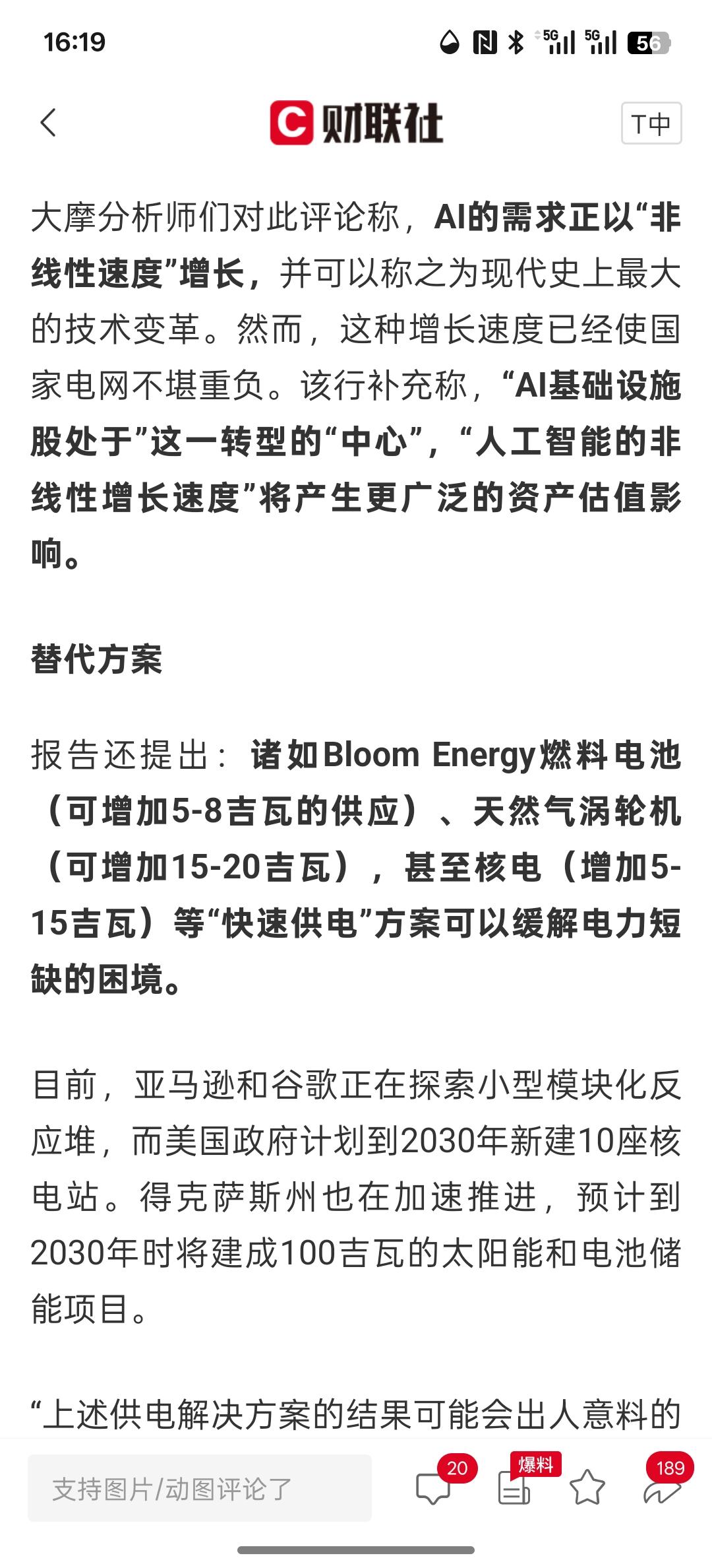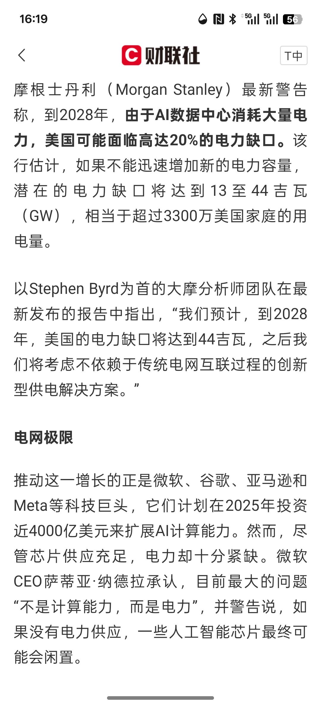 A人工智能I争霸已切换至“能源战场”,2028年美国电力缺口达20%!据相关报告给出的分析结果,AI人工智能的发展对电力的需求将加倍!就是电力缺口将越来越大,但中国在电力能源发展远超出欧美国家的布局!在发展AI人工智能人员是没有任何忧虑!有充足的人员去发展AI人工智能,不管你技术再先进,所有的AI人工智能你都是需要电力,没有电力拿什么运转! 所以这一场AI人工智能将带动能源基础设施的建设!中国在光伏,风电都有着明显的优势,在全球占据的份额高达60%以上!直接就利好中国的中电光伏企业!