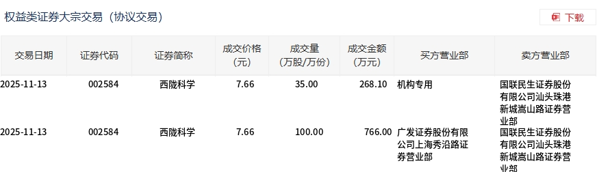 11月13日,西陇科学大宗交易成交135万股,成交额1034.1万元,占当日总成交额的3.98%,成交价7.66元,较市场收盘价8.69元折价11.85%。
