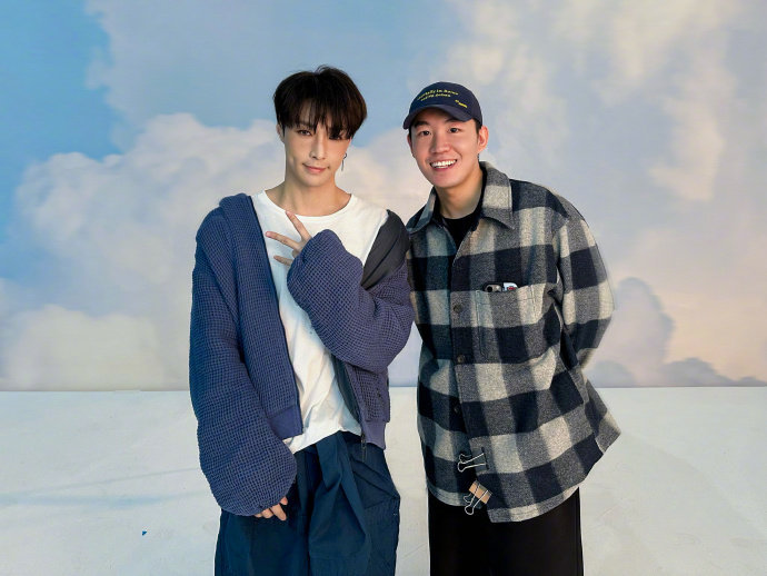 张艺兴与工作人员合照,全包眼线+雀斑妆,状态很好~