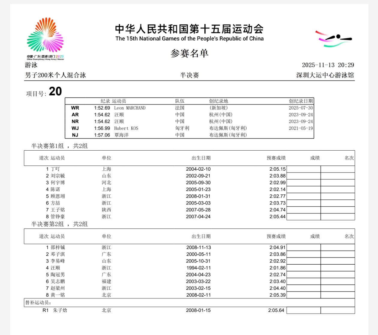 11.13晚半决赛潘展乐男子100米自由泳半决赛 19:20第二组第五道汪顺男子200米混合泳半决赛 20:29第二组第四道