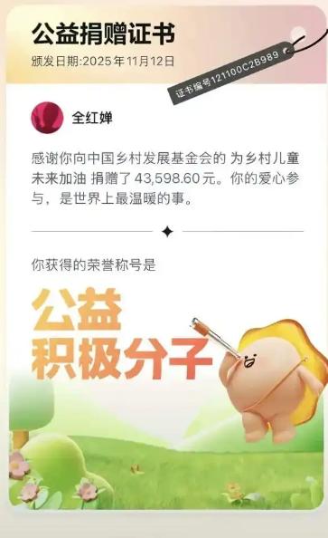 全红婵1小时直播收入43598.6元, 每年享受高额国家津贴的她不差钱, 你猜她拿这笔钱干了啥…… 11月12日晚上,跳水奥运冠军全红婵上线直播,与好友及网友开启连线直播,在线人数一度突破10万人,热心的网友不断给她送礼物,鲜花、跑车和火箭不间断。此前她夺冠后曾在自媒体发文“我真棒”引来网友称赞。 从2018年开始,全红婵在广东省青少年跳水锦标赛崭露头角,此后一发不可收拾,各种奖项拿到手软,还获得了各种荣誉称号和社会类奖项。 世界泳联发布的407C慢动作视频中,其起跳如“利剑出鞘”,入水近乎垂直,被定为全球训练模板 。 16秒视频里,她从起跳到入水,身体如刀锋般划开空气,水花几乎不见。评论区刷屏“教科书级动作”“流体力学的艺术”。 而这次直播1小时获得的收益,她全部捐献给了“中国乡村发展基金会”,资助了乡村儿童。我们一起为婵宝点赞[赞][赞][赞]