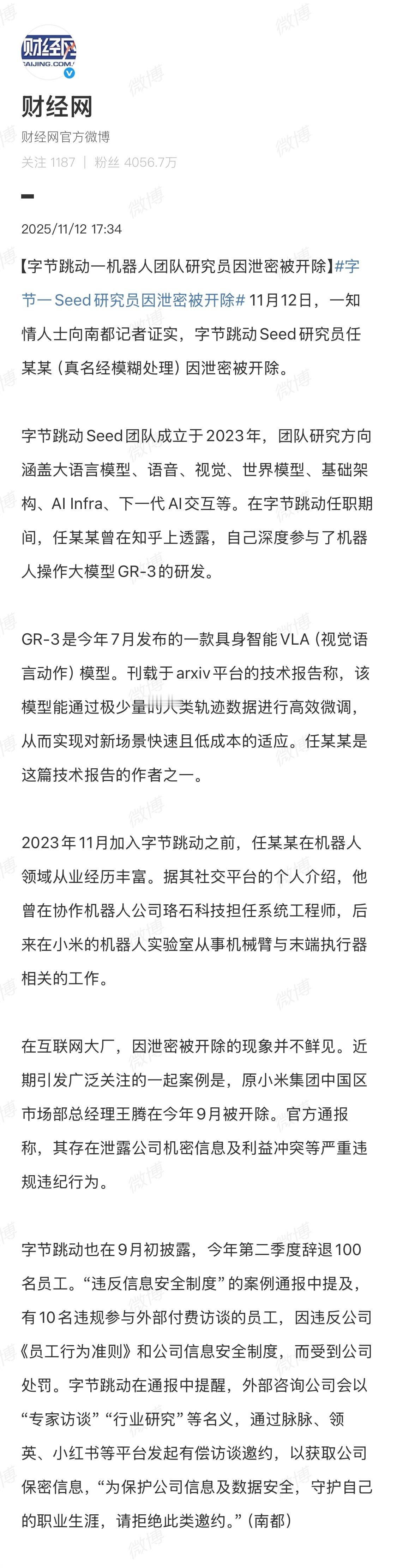 这太冲击三观了。媒体爆料,一位Seed研究员离开了字节,其离职原因或是“因多次泄密被开除”。从当事人的履历来看,妥妥的技术大牛啊。不管是主动离职,还是被开除,seed可是整个字节都羡慕的部门。按理说,在高薪和顶级待遇下,大部分人应该都是安心干活的吧?