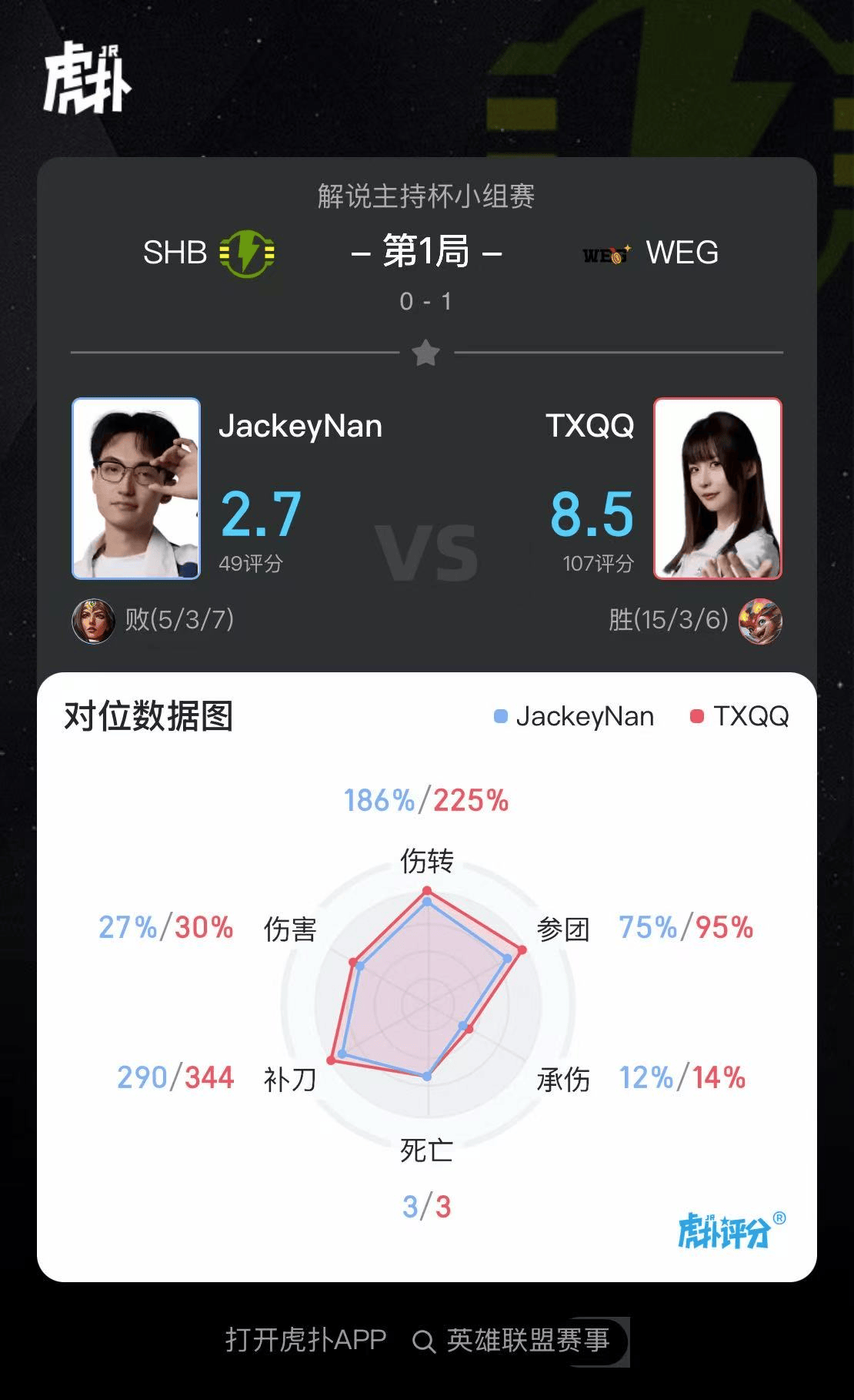 虎扑11月13日讯在刚刚结束的WEG对阵SHB的BO1比赛中,TXQQ小火龙打出15/3/6战绩,斩获WEG对阵SHB第一局MVP