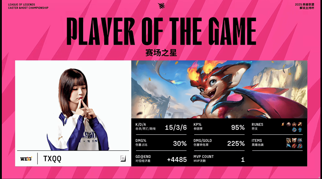 TXQQ小火龙打出15/3/6战绩,斩获WEG对阵SHB第一局MVP
