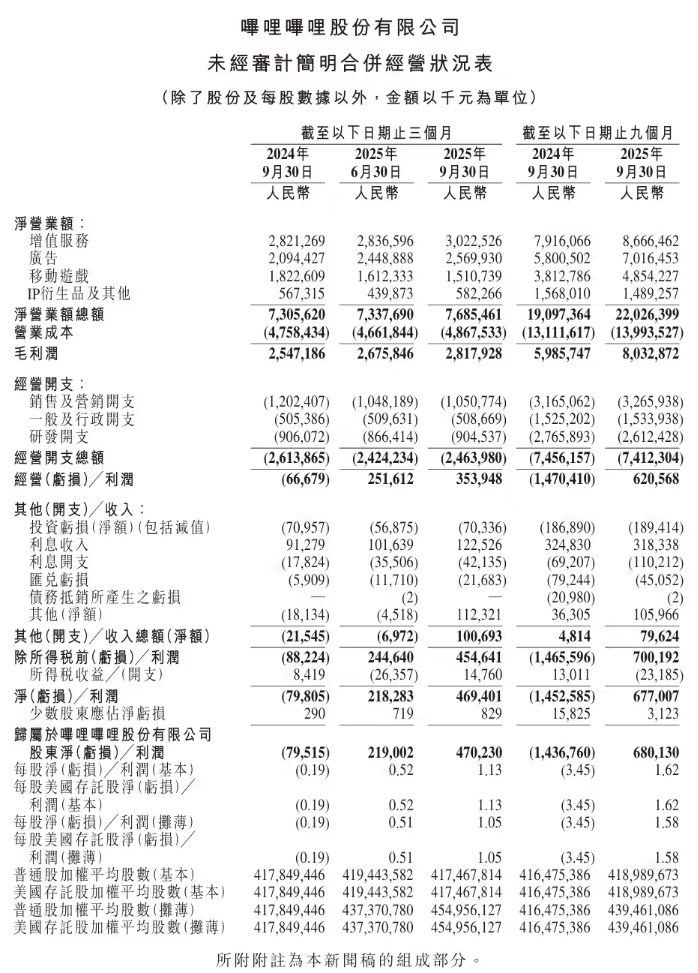 第三季度B站各业务营收如下: