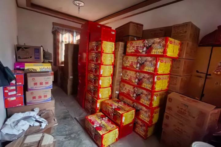 为避免安全风险扩大,民警迅速展开核查摸排,精准锁定涉案人员身份及存储窝点,当民警到达现场时,眼前的景象让人震惊,屋内堆满了各类烟花爆竹,密密麻麻足足217箱,经称重总重高达2844.85公斤。