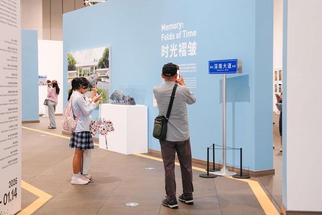 当观众走进展厅,就被展陈设计所吸引——“深南大道”被搬进了展厅。红绿灯、道路标识、《拓荒牛》雕塑,瞬间将观众带入峥嵘岁月。展览通过“时光褶皱”“流动的风景”“人间剧场”“未来诗篇”四大板块,从地缘政治、空间生产与日常实践三个层面构建深南大道的多元艺术叙事。