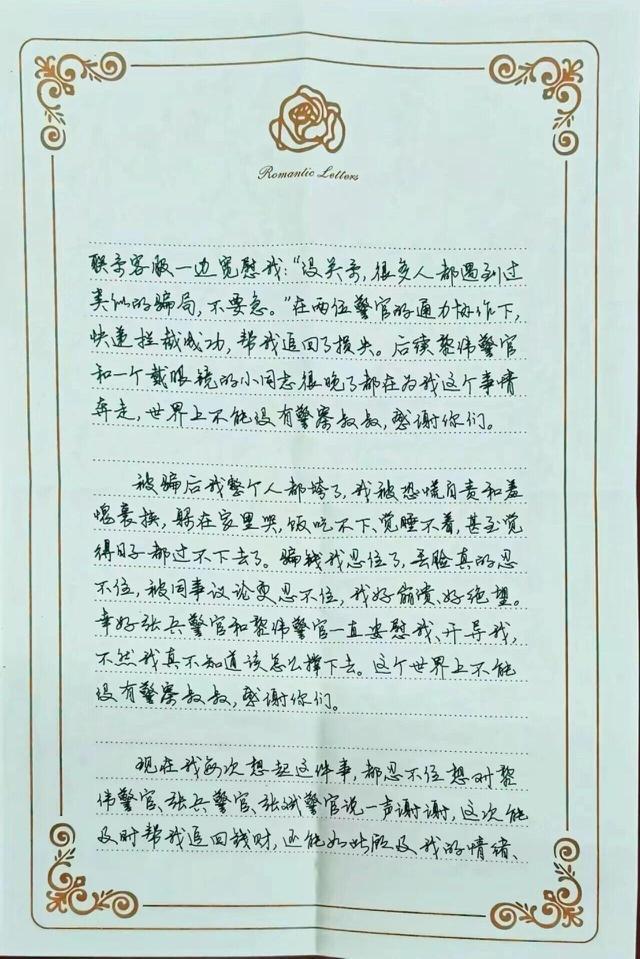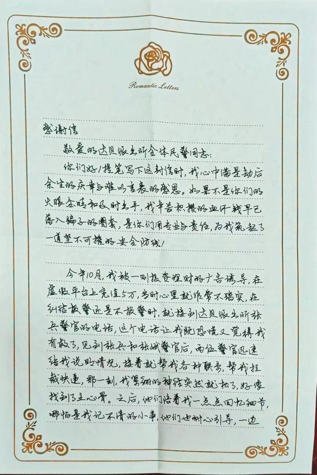“如果不是你们的火眼金睛和及时出手,我辛苦积攒的血汗钱早已落入骗子的圈套,是你们用专业与责任,为我筑起了一道坚不可摧的安全防线!”11月3日,东川区公安局达贝派出所收到一封落款为“一位害怕暴露姓名的胆小女士”的来信,字里行间满是感激与信任。