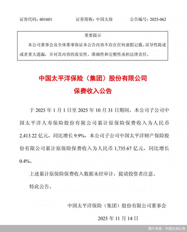 北京商报讯(记者李秀梅)11月13日,中国太平洋保险(集团)股份有限公司(以下简称“中国太保”)公告,2025年1至10月,公司子公司中国太平洋人寿保险股份有限公司累计原保险保费收入为2413.22亿元,同比增长9.9%,公司子公司中国太平洋财产保险股份有限公司累计原保险保费收入为1735.67亿元,同比增长0.4%。