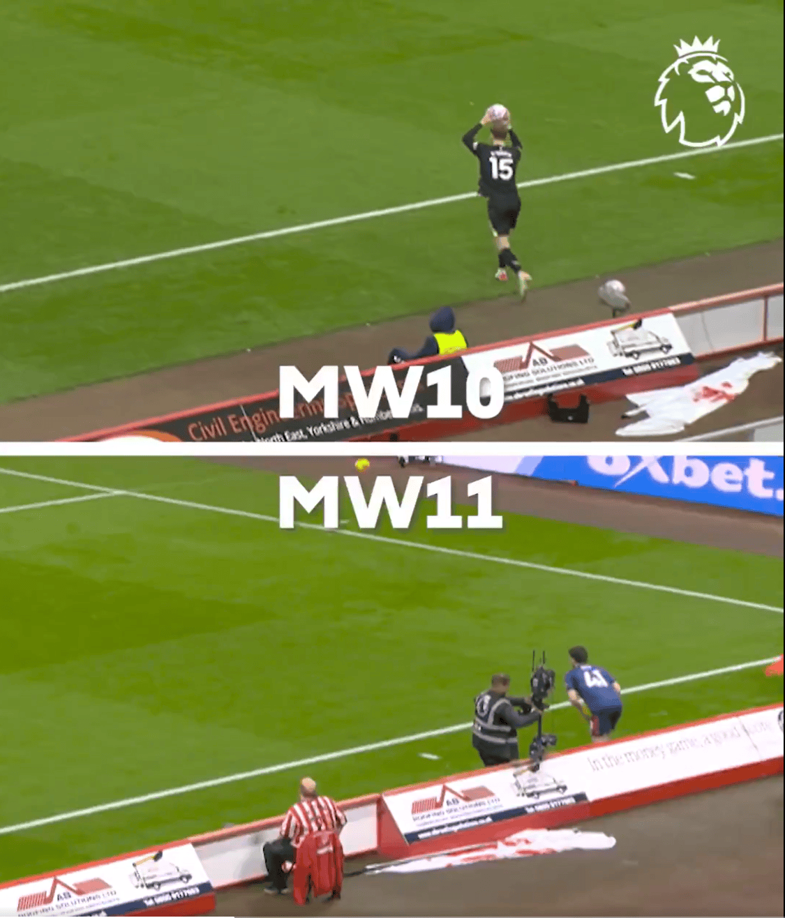 从对比图可以看出,在第10轮对阵埃弗顿时,场边广告牌离草地还有一段距离;而在第11轮对阵阿森纳时,广告牌被移动到了草地上。