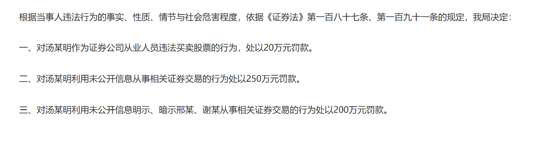 处罚来看,一是对汤某明作为证券公司从业人员违法买卖股票的行为,处以20万元罚款;二是对汤某明利用未公开信息从事相关证券交易的行为处以250万元罚款;三是对汤某明利用未公开信息明示、暗示邢某、谢某从事相关证券交易的行为处以200万元罚款。以上合计对汤某明处以470万元罚款。