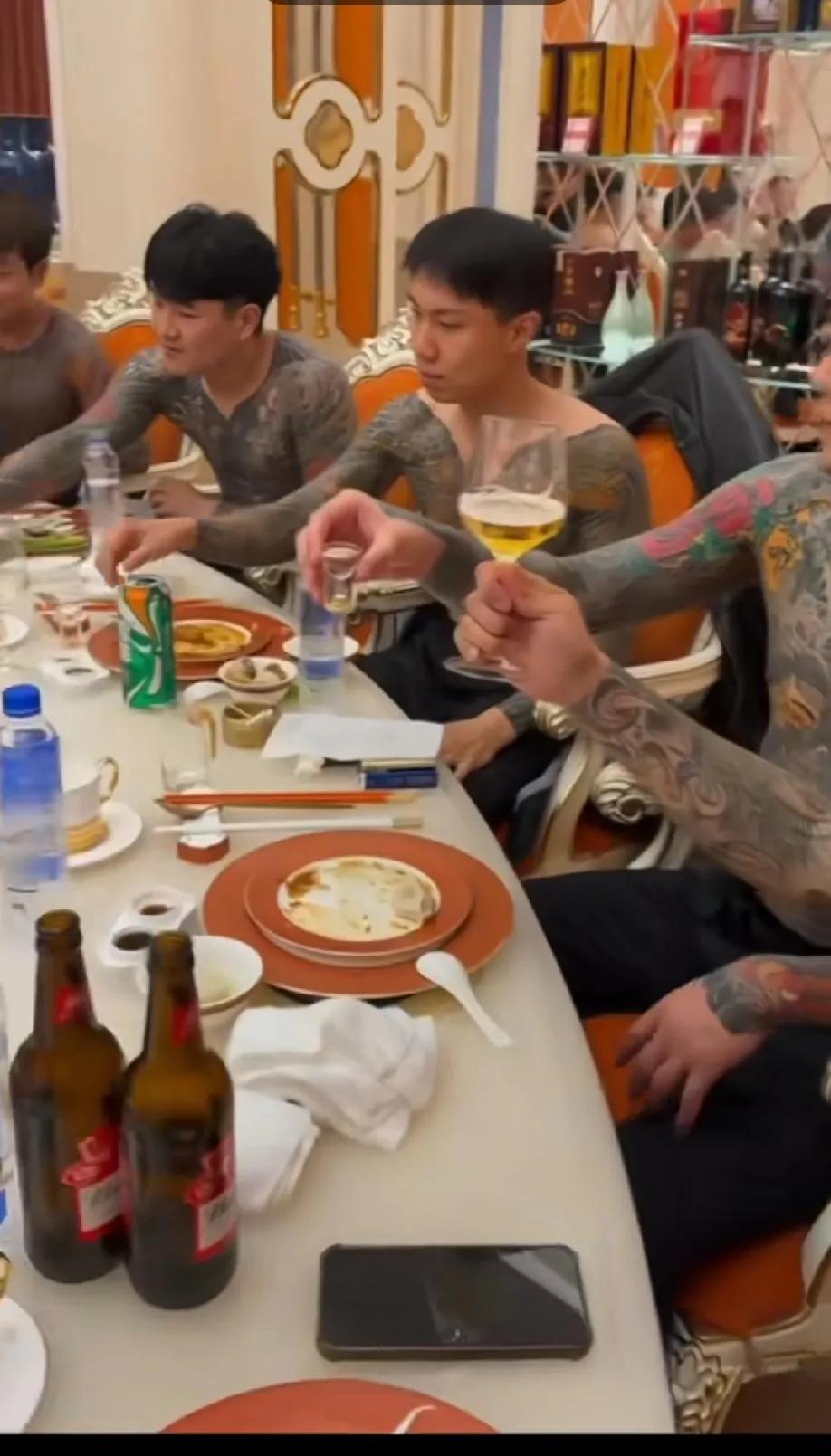 这些人的身上全是雕龙画凤,干啥的呢,吃个饭,为了展示纹身的美,上衣都不穿。 可能