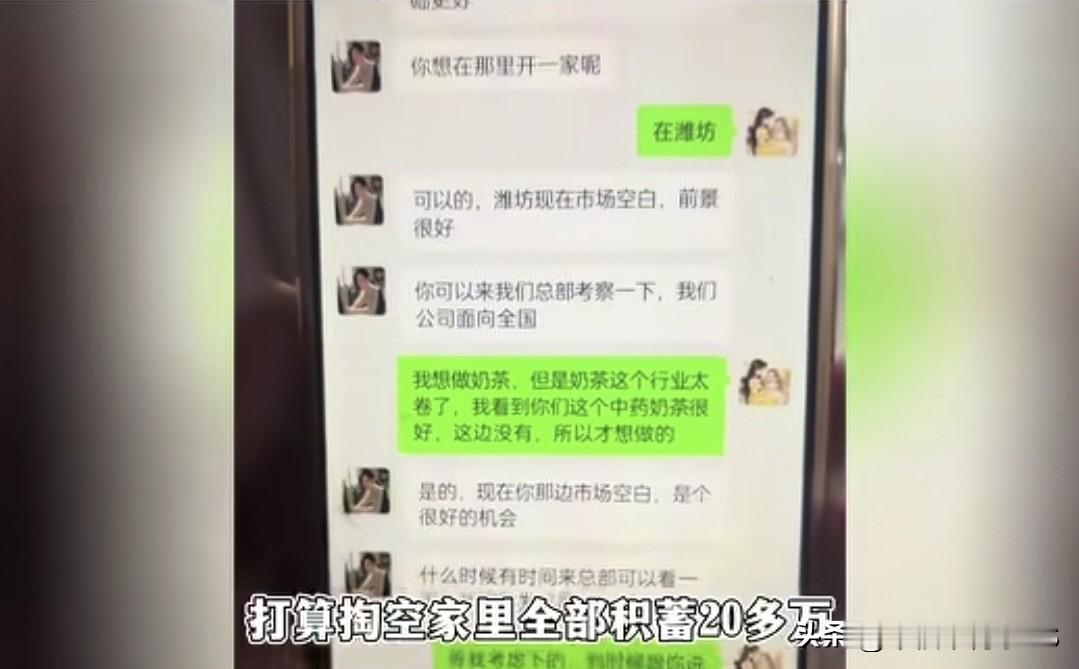 90后宝妈瞒着 老公,掏空家里20多万积蓄非要开个中药奶茶店,还扬言要“拳打蜜雪,脚踢瑞幸”! 这宝妈自学了点中医,就觉得自己能把中药和奶茶完美融合,在蜜雪冰城和瑞幸中间开个店,理由是蜜雪便宜但不健康,瑞幸干净但不会煮中药,只有她能行,甚至觉得不久就能成县城首富! 老公偷看手机发现后人都麻了,自己在外面打工攒的工资全被嚯嚯了,差点气晕过去。