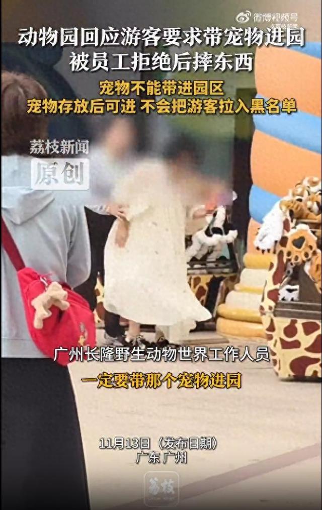 近日,广东广州长隆野生动物世界,一女游客因为动物园不让宠物入内跟员工吵架,随意砸摔东西。