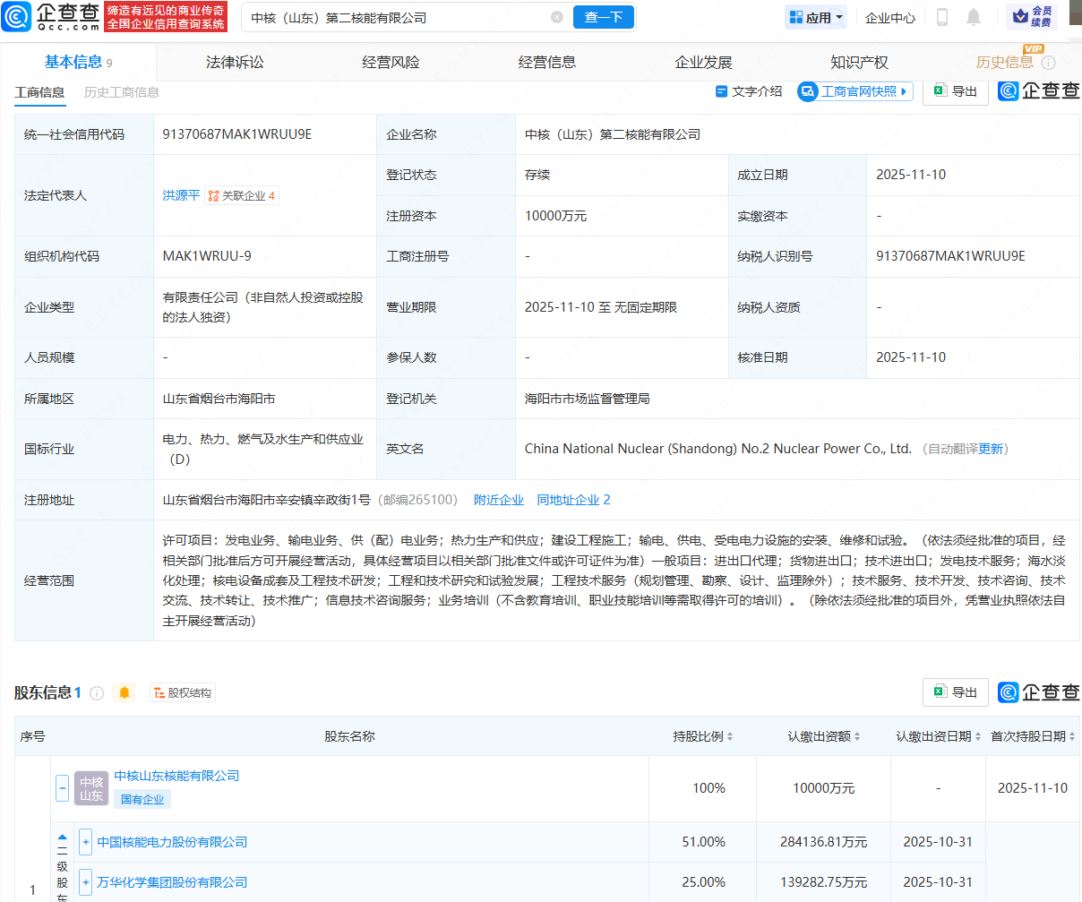 企查查APP显示,近日,中核(山东)第二核能有限公司成立,法定代表人为洪源平,注册资本为1亿元,经营范围包含:发电业务、输电业务、供(配)电业务;热力生产和供应;发电技术服务;海水淡化处理等。企查查股权穿透显示,该公司由中国核电(601985)旗下中核山东核能有限公司全资持股。