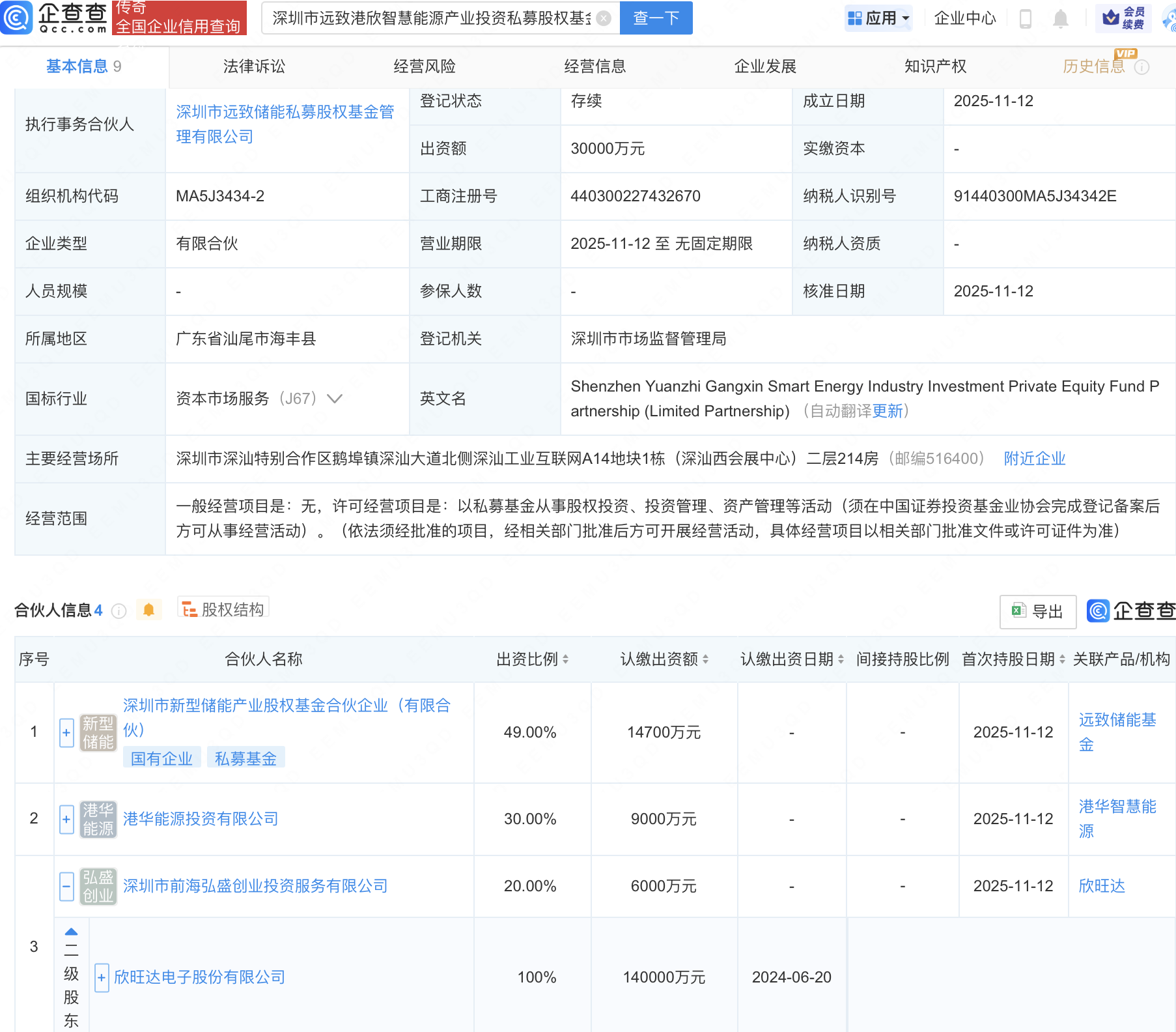 企查查APP显示,近日,深圳市远致港欣智慧能源产业投资私募股权基金合伙企业(有限合伙)成立,出资额3亿元,经营范围包含:以私募基金从事股权投资、投资管理、资产管理等活动。企查查股权穿透显示,该企业由欣旺达(300207)全资子公司深圳市前海弘盛创业投资服务有限公司、深圳市新型储能产业股权基金合伙企业(有限合伙)等共同出资。