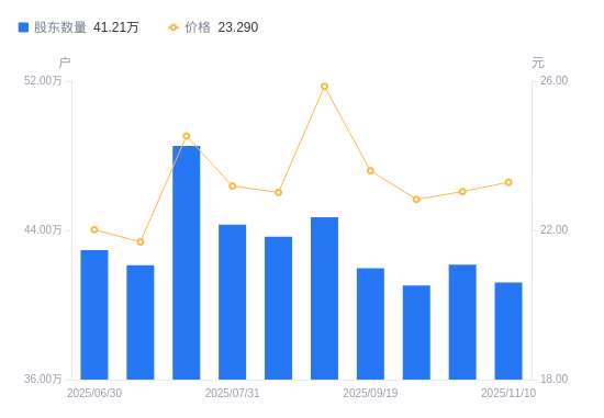 日期A股户数(户)流通A股户均持股数(股)户均持股市值(万元)2025-11-104121303852.998.972025-10-314216543765.968.682025-09-304104863868.428.832025-09-194197283783.248.932025-08-294471233551.449.182025-08-084366753636.428.372025-07-314430583584.038.312025-07-204852673272.298.032025-07-104212533769.558.182025-06-304294273697.798.14