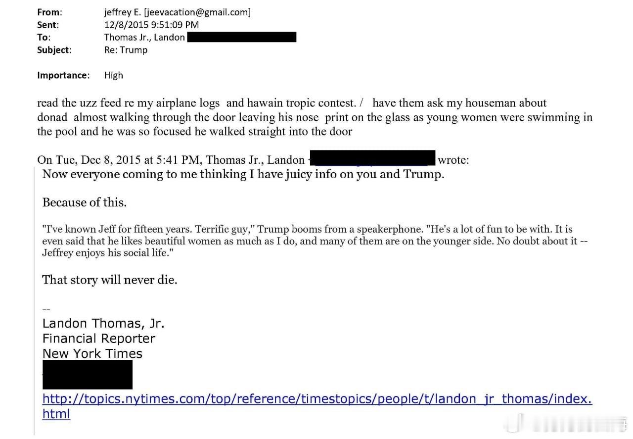 杰弗里·爱泼斯坦在2015年12月发给《纽约时报》记者托马斯·兰登的一封电子邮件中写道:问问我的管家,唐纳德·特朗普差点就撞门而入,在玻璃上留下了鼻印,当时几个年轻女子正在泳池里游泳。他当时太专注于她们了,结果径直撞到了门上。