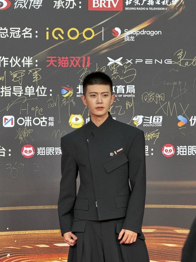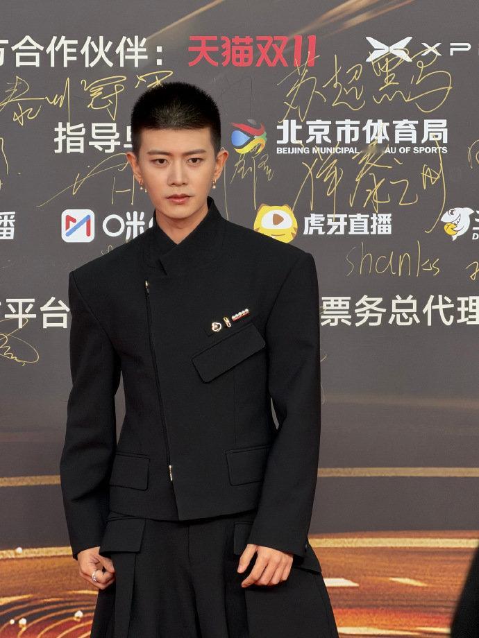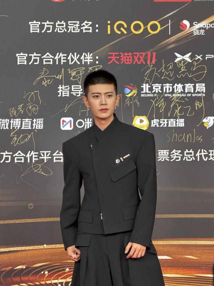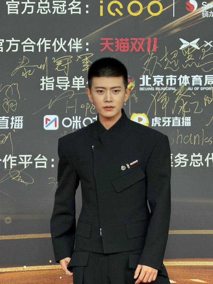 任嘉伦寸头配全黑西装亮相竞燃之夜,珍珠耳环增添质感,面部轮廓英气十足,被粉丝夸