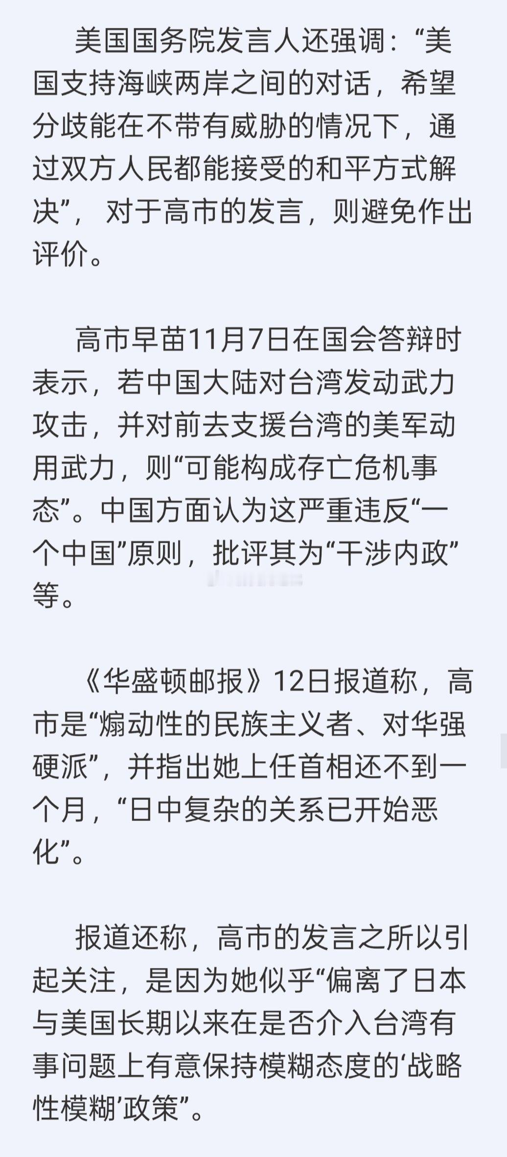 美国国务院发言人11月12日就日本首相高市早苗答辩称“台湾有事可能构成存亡危机事态”一事发表声明称:“美国致力于维护台湾海峡的和平与稳定,反对双方任何一方单方面改变现状”。但对于高市的发言,则避免作出评价。《华盛顿邮报》12日报道称,高市是“煽动性的民族主义者、对华强硬派”,并指出她上任首相还不到一个月,“中日复杂的关系已开始恶化”。报道还称,高市的发言之所以引起关注,是因为她似乎“偏离了日本与美国长期以来在是否介入台湾有事问题上有意保持模糊态度的‘战略性模糊’政策”。