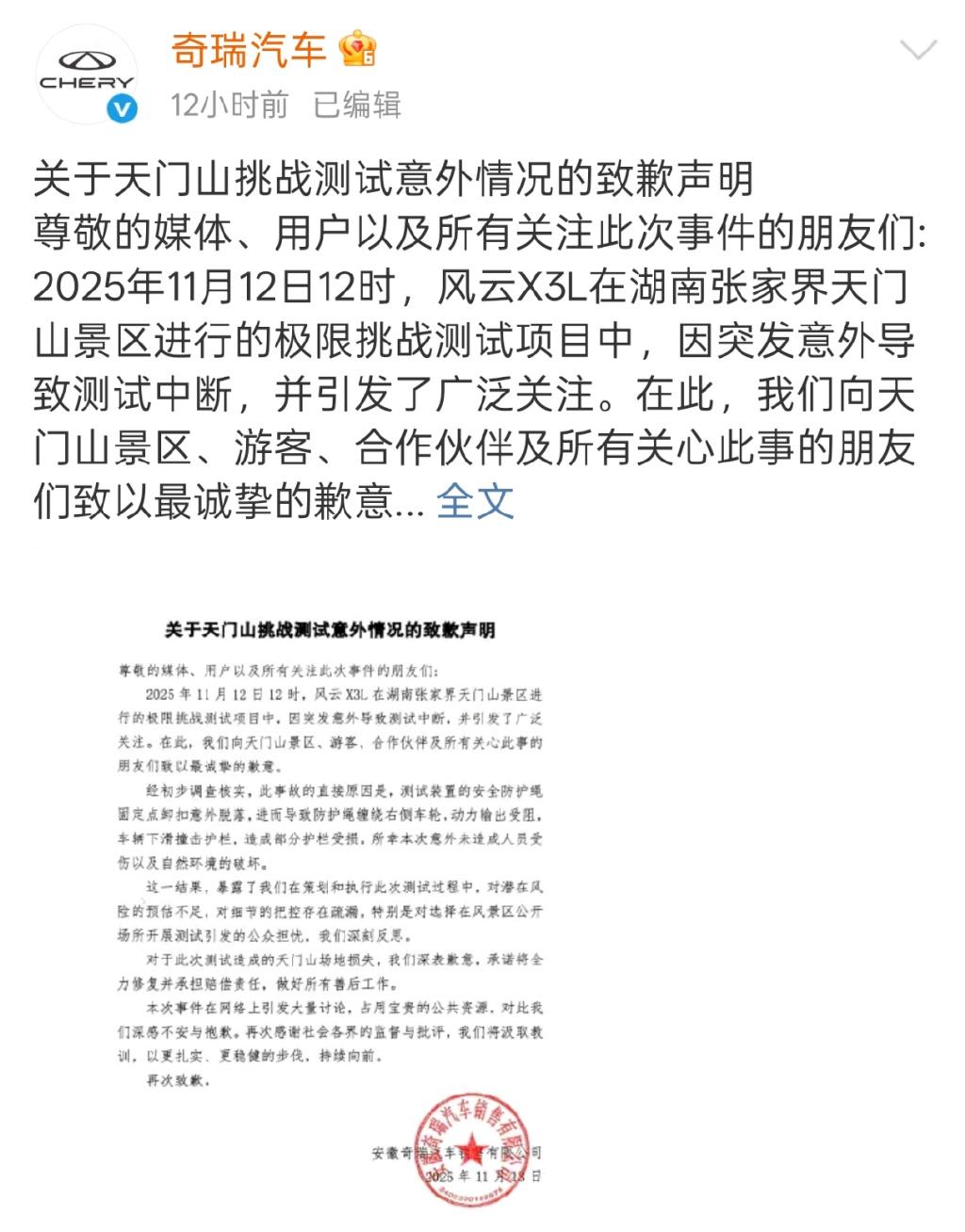 声明中,奇瑞汽车称,“11月12日12时,风云X3L在湖南张家界天门山景区进行的极限挑战测试项目中,因突发意外导致测试中断,并引发广泛关注。在此,我们向天门山景区、游客、合作伙伴及所有关心此事的朋友们致以最诚挚的歉意。”