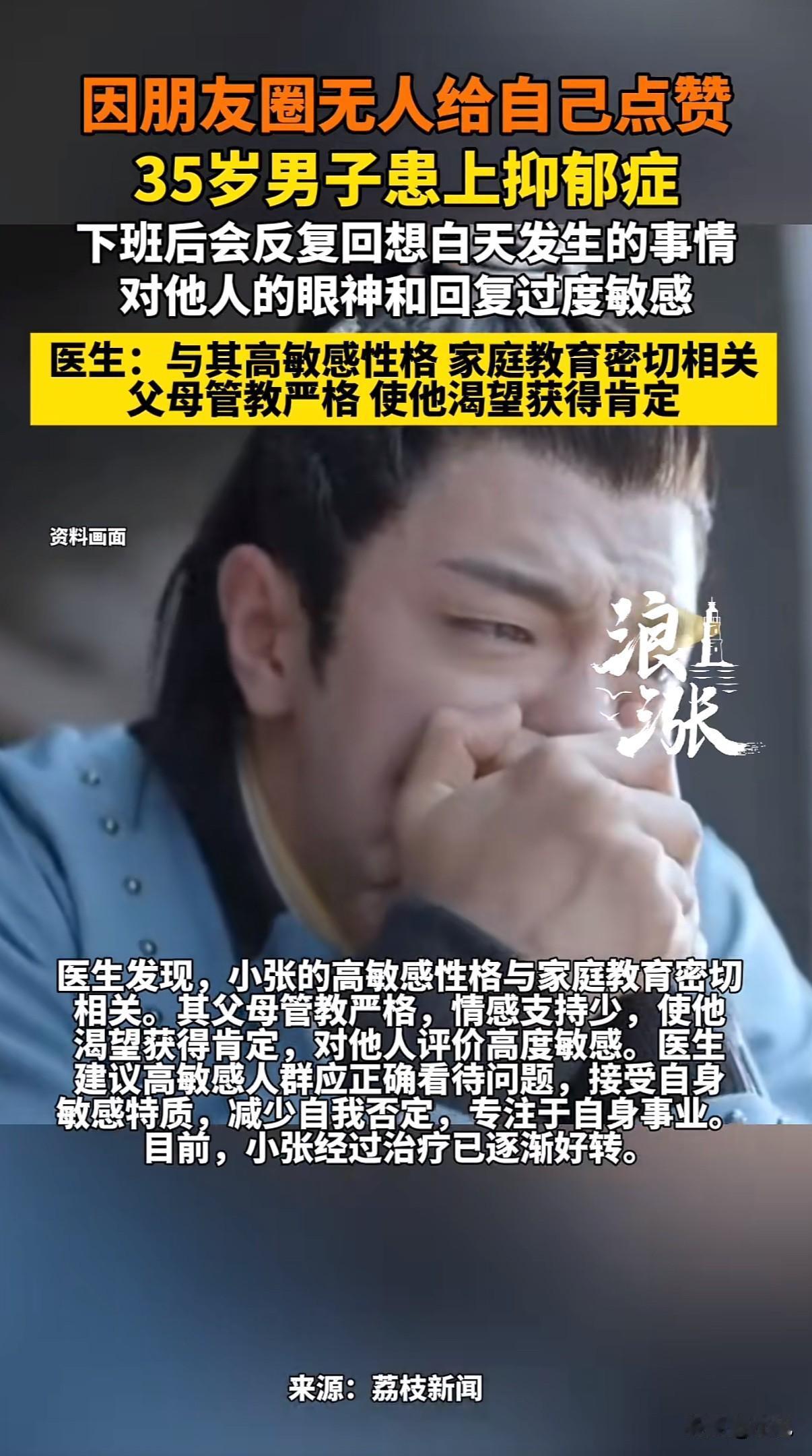 朋友圈没人点赞,竟患上抑郁症! 淮安的张先生,每天下班后都在反复回想白天的对话、别人的眼神。朋友圈发了没人回应,他就开始焦虑,甚至出现头晕、出汗这些身体反应。 医生诊断他患上了抑郁症。 深入了解后发现,问题根子在他的成长环境。父母管教特别严格,却很少给他情感上的支持。这种环境下长大的孩子,往往会养成一种习惯——把自己的价值完全建立在别人的评价上。 别人一个不经意的皱眉,他能理解成“他讨厌我”;微信回复慢了几分钟,他觉得“我是不是说错话了”;朋友圈没人点赞,他就想“我这个人真失败”。 虚拟世界的互动,在他心里变成了现实人际关系的衡量标准。 其实生活中,像张先生这样高敏感的人不少。他们不是脆弱,只是从小习惯了通过外界的反馈来确认自己的位置。 这种性格特质本身不是问题,问题出在过度依赖外界的认可来定义自己。 我觉得,每个人都需要在内心建立一个稳定的自我评价体系。别人的看法可以参考,但不能成为衡量自我价值的唯一标准。 特别是现在这个时代,线上线下生活分不开,更需要分清虚拟互动和真实价值的关系。 你的价值,不应该由几个点赞来决定。 你有过类似的感受吗?会不会也因为别人的反应而过度纠结?