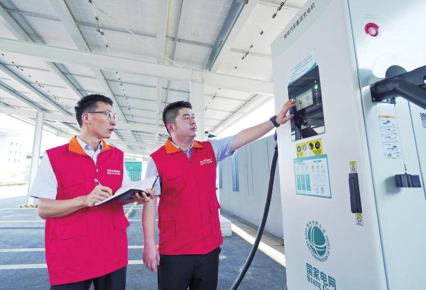 国网安徽电力(合肥)皖美共产党员服务队员对充电设施进行安全巡视。
