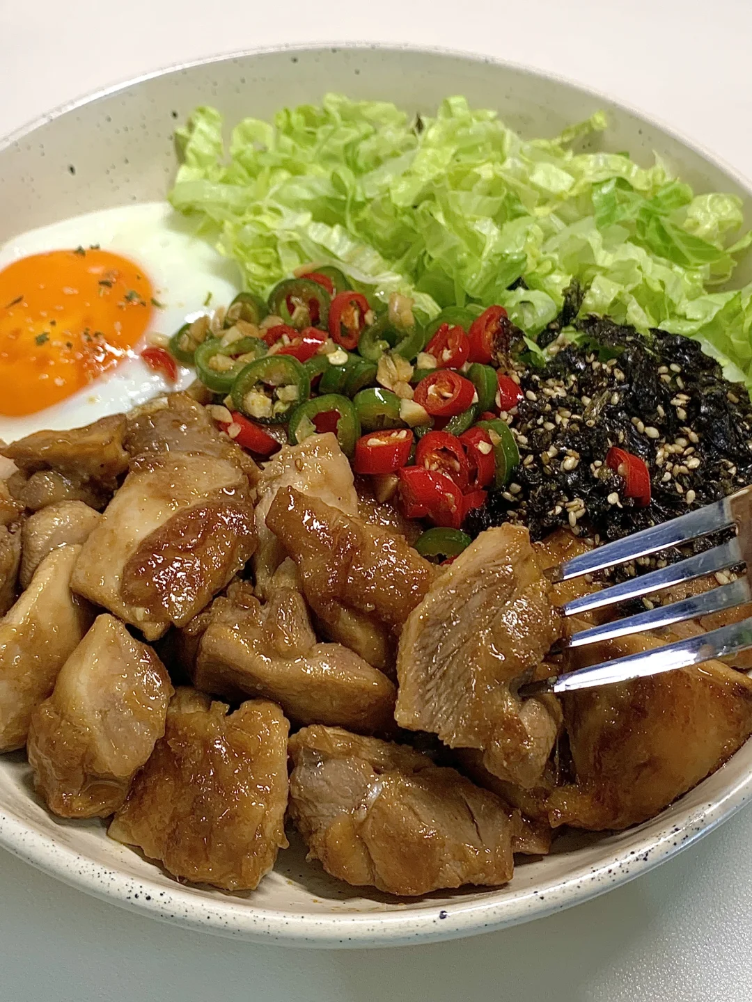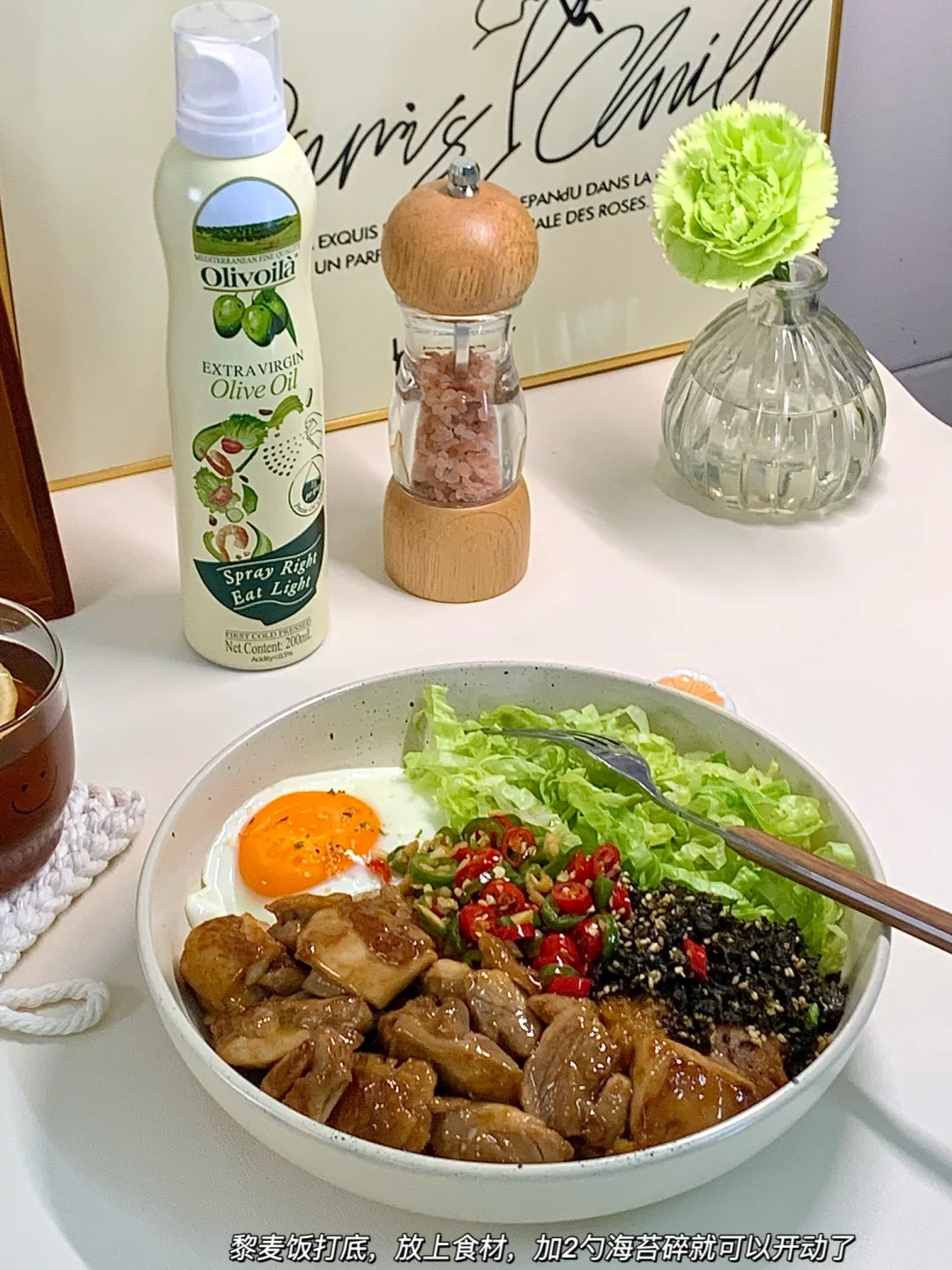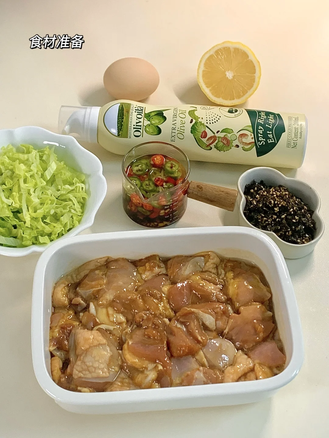 🧑🏻🍳食材:鸡腿、鸡蛋、生菜、欧丽薇兰橄榄油、海苔碎、青红椒