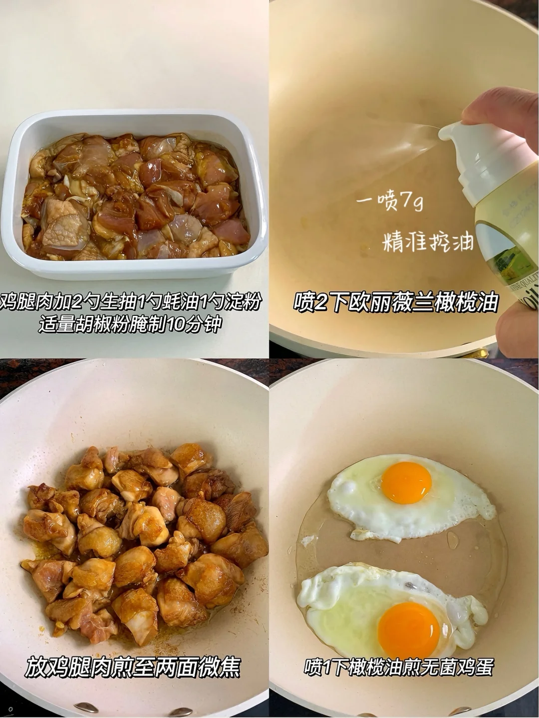 2️⃣锅内喷两下橄榄油,大概14g,下鸡腿中火两面煎熟
