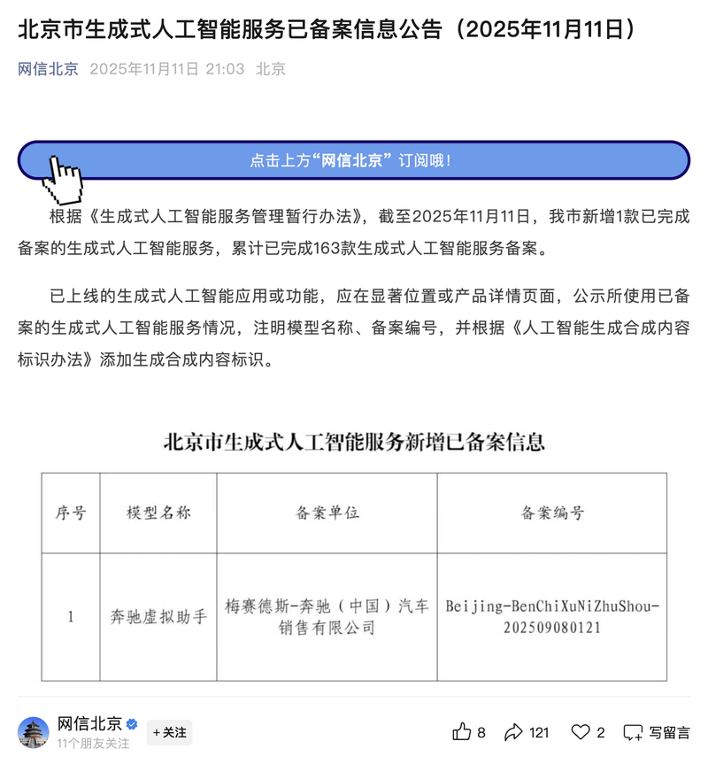 易车讯日前,网信北京发布北京市生成式人工智能服务已备案信息公告。由北京推荐备案的梅赛德斯-奔驰(中国)汽车销售有限公司“奔驰虚拟助手”大模型,通过中央网信办等多个国家部门审批,成为全国首批、北京首款获批上线的外企大模型产品。