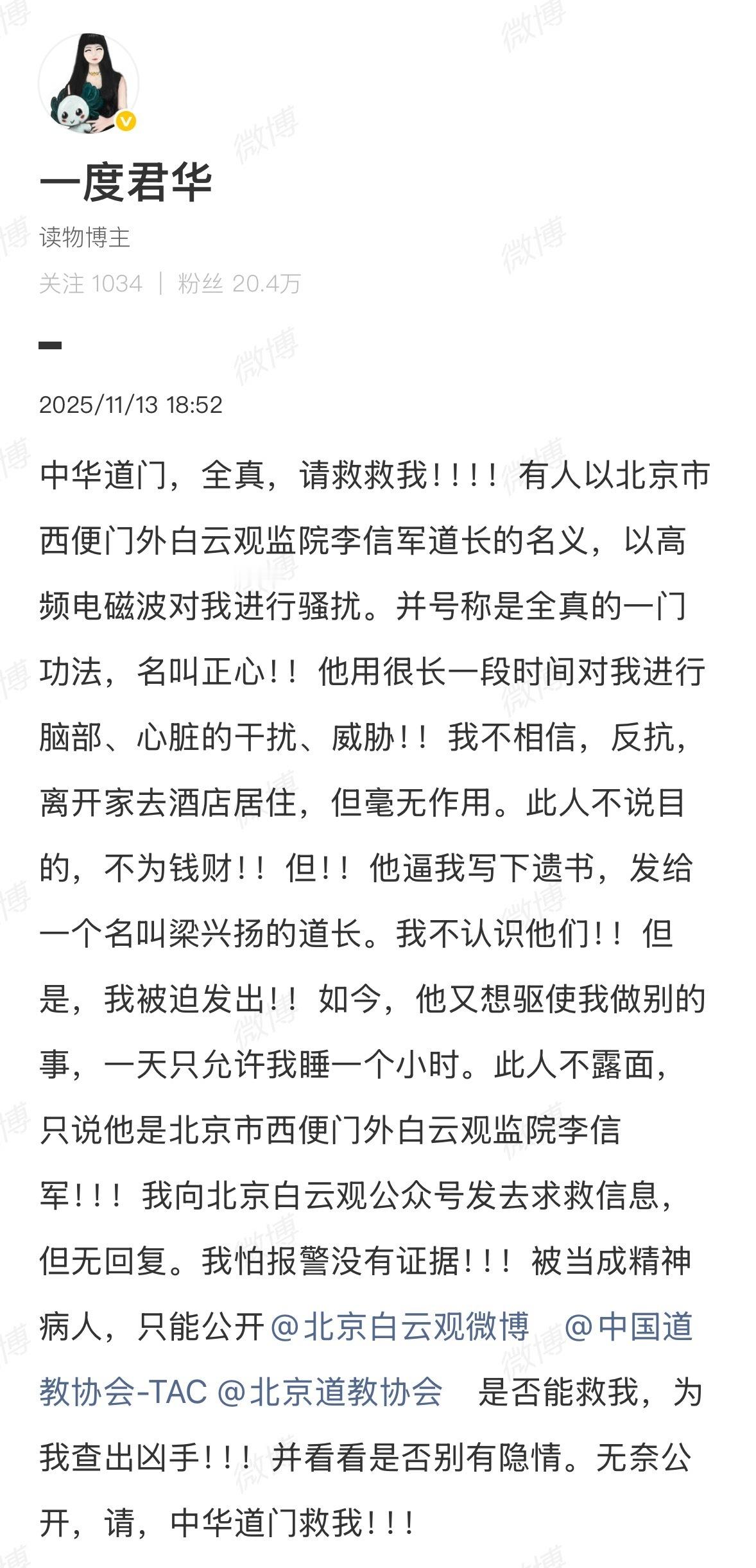星落凝成糖的作者一度君华求救,不过这种脑控、什么电磁波伤害的其实大概率是精神分裂