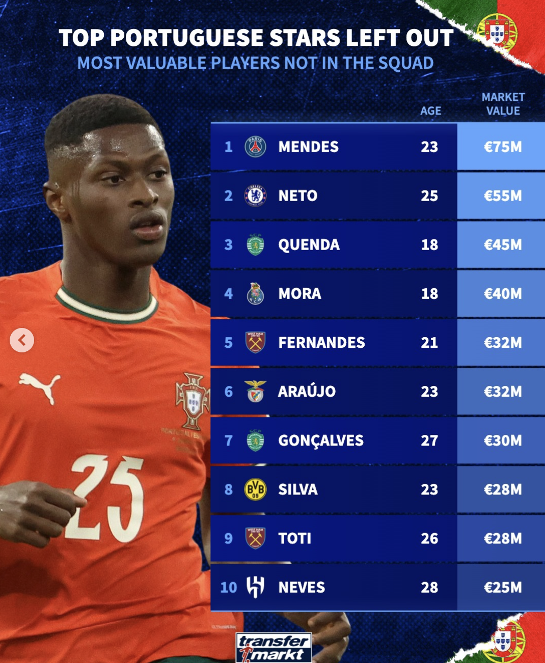 落选最新期葡萄牙队球员身价榜:门德斯、内托和昆达排前三