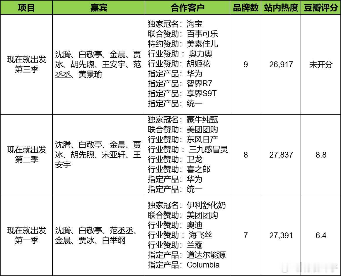🌈《现在就出发》三季合作品牌及热度梳理‼️回顾前两季,第一季整体热度不错,依靠嘉宾零散笑点,没能实现圈层突破,可以称得上圈内爆款;第二季则迎来了口碑巅峰,创下🐧综艺多项纪录。热度口碑双丰收,成为综艺标杆。从合作客户数量来看,从7-9个很难得的渐入佳境的综艺节目,确实依赖于顶配的嘉宾阵容,居高不下的热度及好口碑,给了各位广告主极大的信心。可以看到,华为、统一、美团都合作了两季,华为在第三季更是四个产品线的合作。第三季目前更新了三期,口碑上稍有点小波动,但刚开播不久,可以耐心看完整个节目,再来一起感受下。