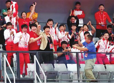唐婧夺冠后,小将惠欣冉急忙跑下看台,第一时间来到混采区,乖乖地等在旁边,见唐婧接受完采访马上就跳到大姐姐的身上,两人抱在一起就不分开了,胜似亲姐妹。就在前一天,吴卫凤给惠欣冉和陶昱颖颁完奖,亲了这个亲那个,和丈夫赵治山教练两人一人搂一个合影时就像一家人。记者李蓓(本报肇庆电)