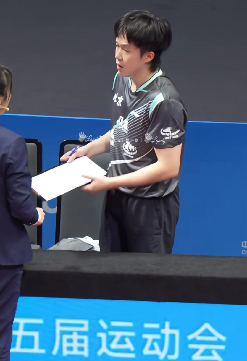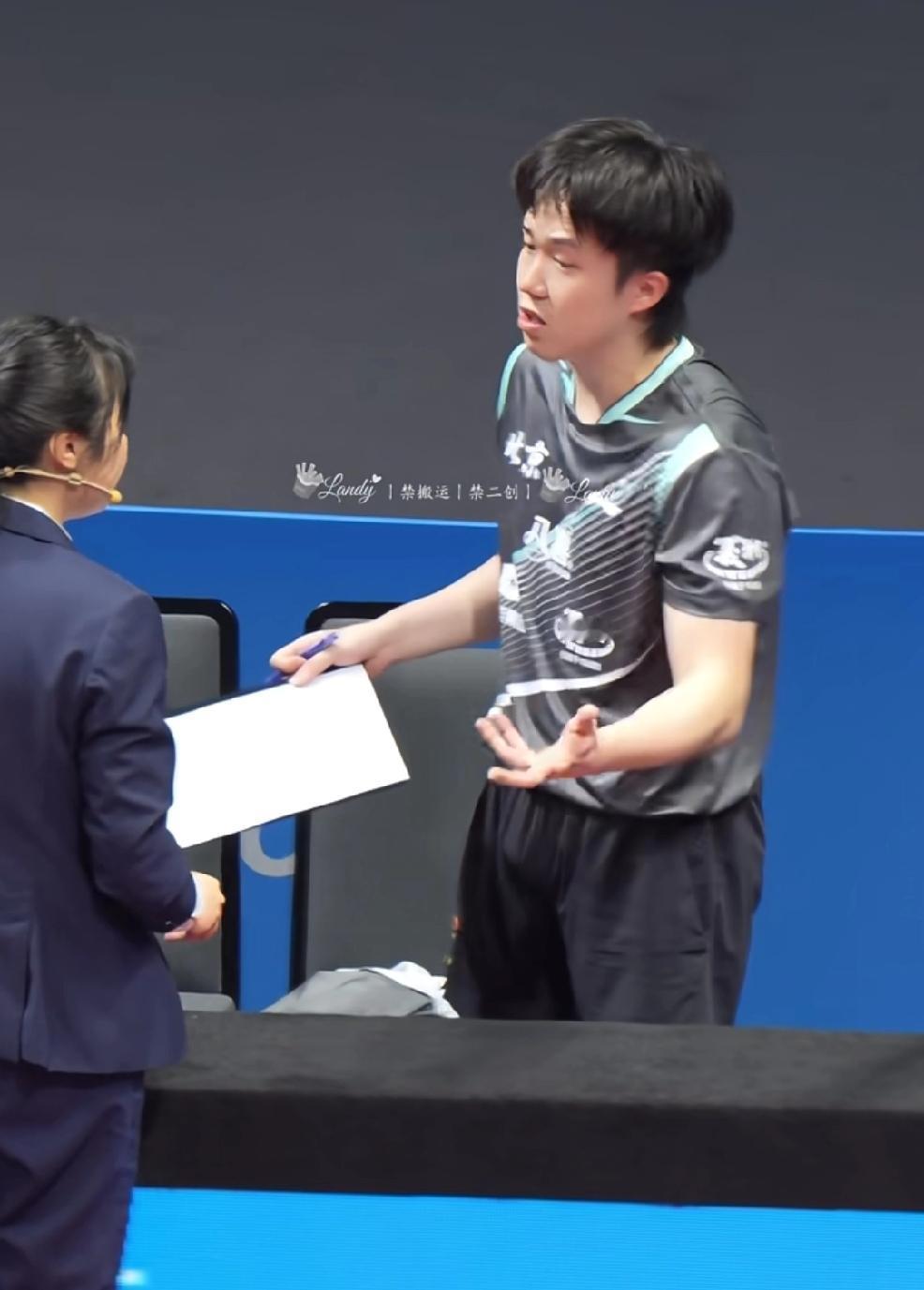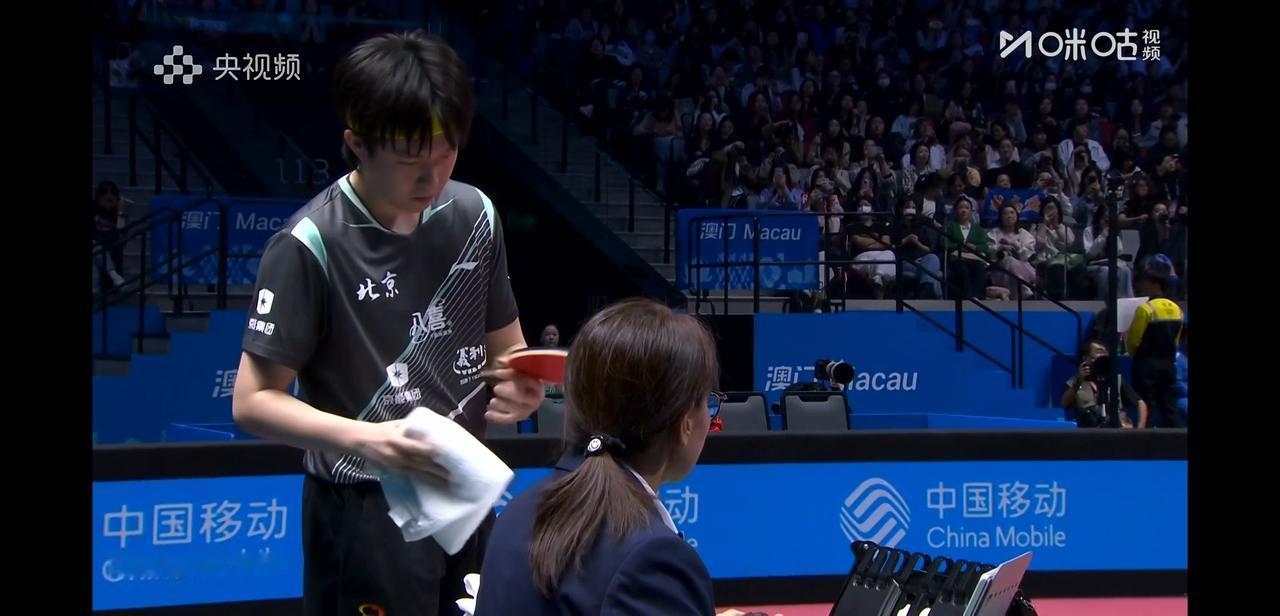 王楚钦昨晚比赛带了条毛巾, 毛巾放在拍子下面, 可能是为了垫一下拍子, 但是第一局结束后局间结束后回来毛巾不见了。 这个时候王楚钦急了, 马上过去问了裁判。 看得出来楚钦看到拍子被动了, 一下子慌了, 一朝被蛇咬,十年怕井绳, 真的是害怕了。 比赛完还在跟裁判说着什么, 难道毛巾不能用来垫一下拍子吗?
